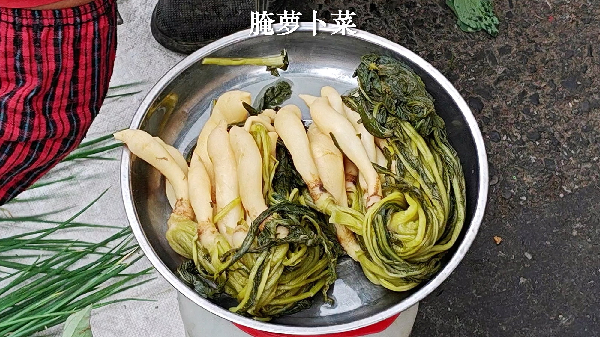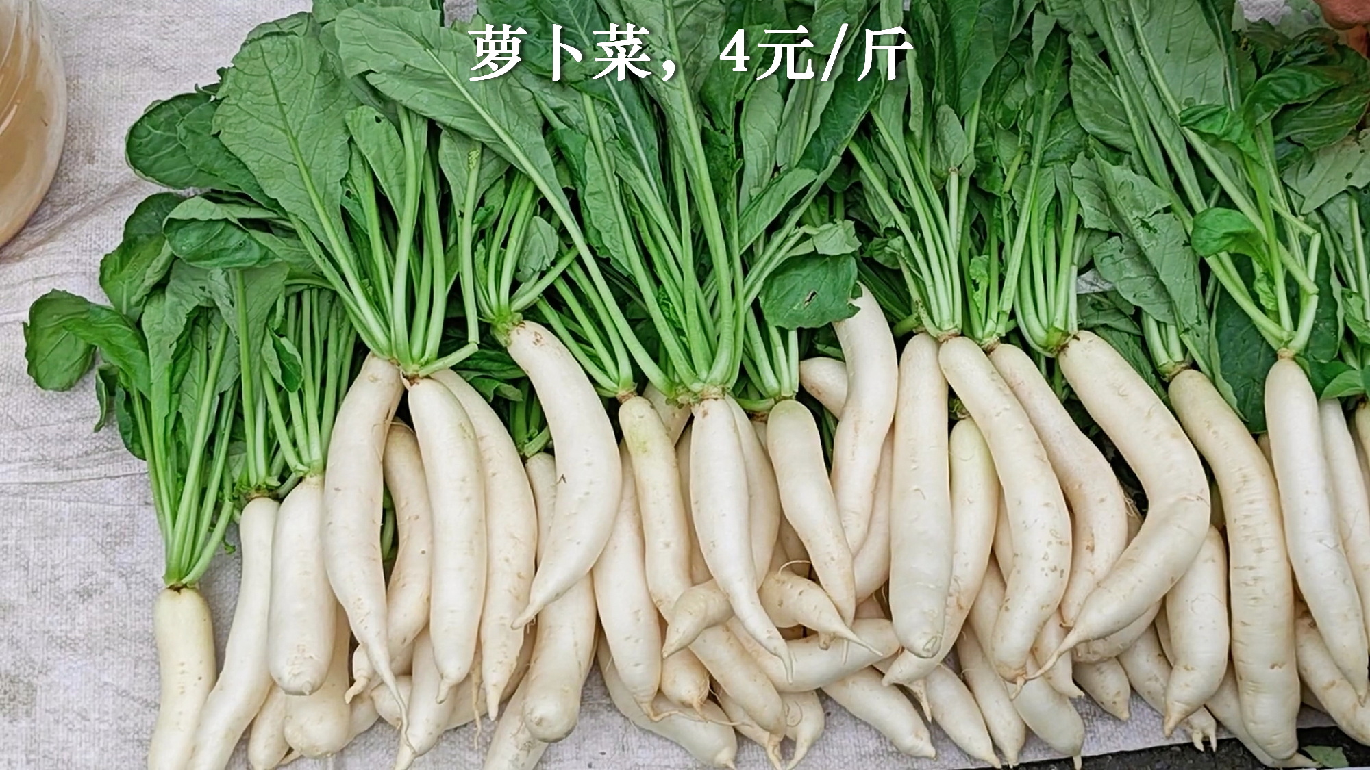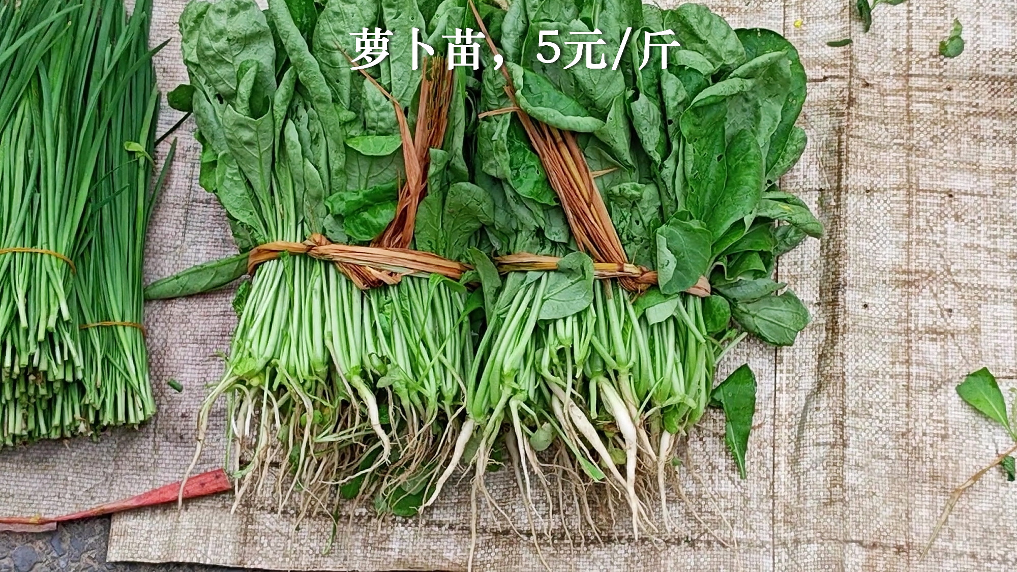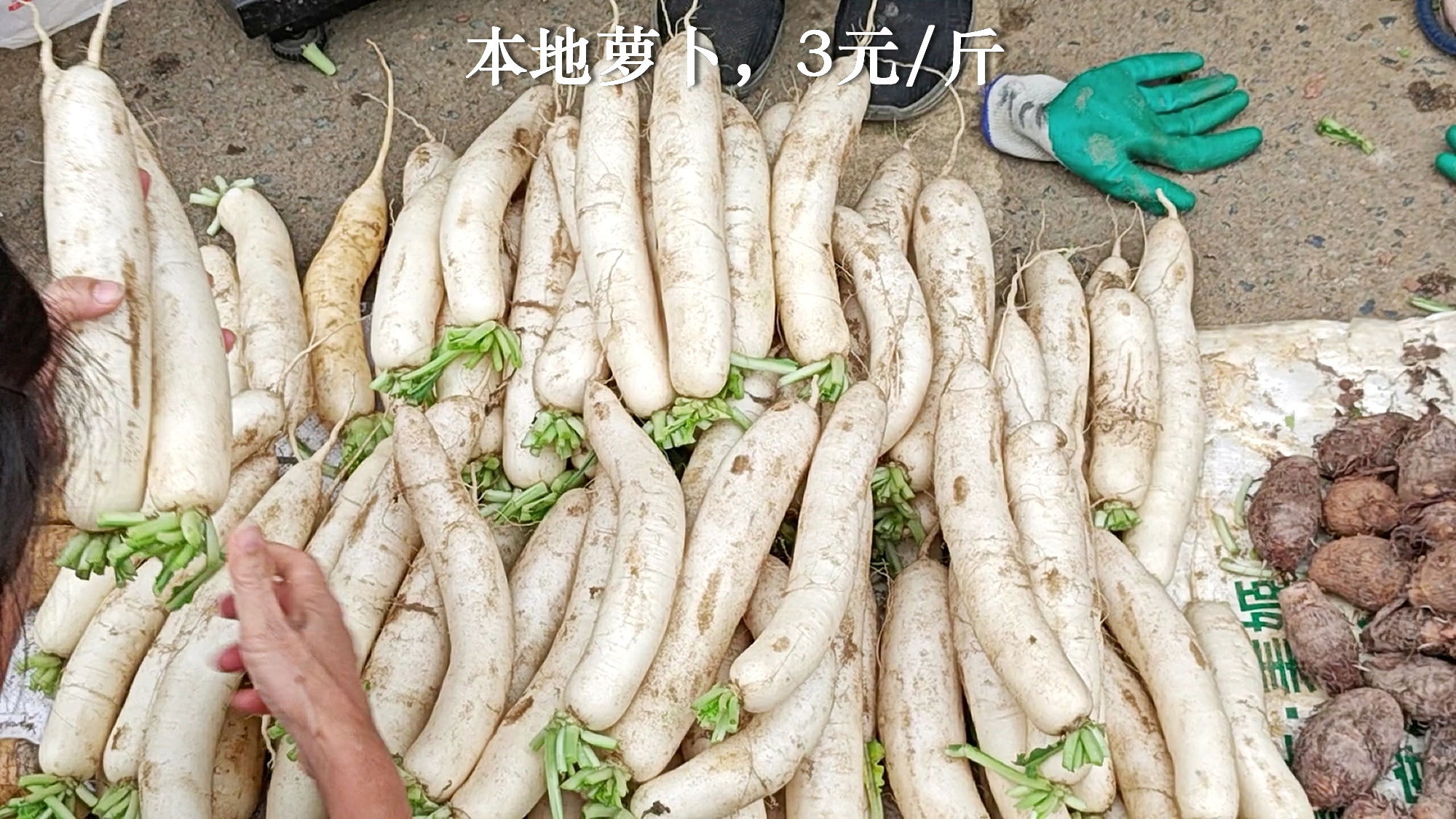 4、菜心之外,最大宗的是本地萝卜和萝卜苗。市场上可以见到整个萝卜家族,不带叶子的本地萝卜3元/斤,一半小萝卜一半叶子的萝卜菜,是4元一斤,基本纯叶子的萝卜苗,则是5元一斤,总结,萝卜越小价格越贵。另外还有腌制的带叶子萝卜仔,萝卜家族真够全的。