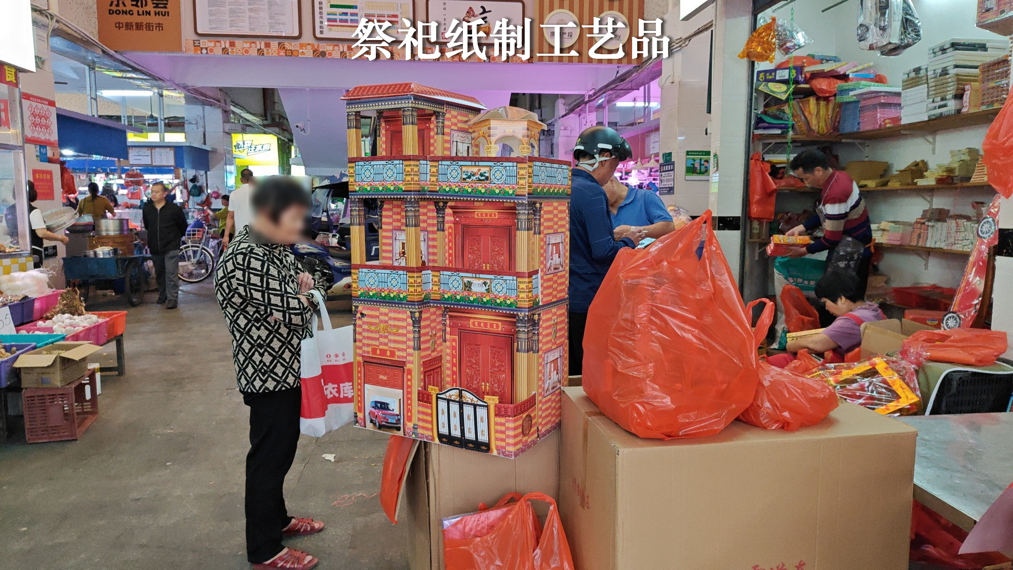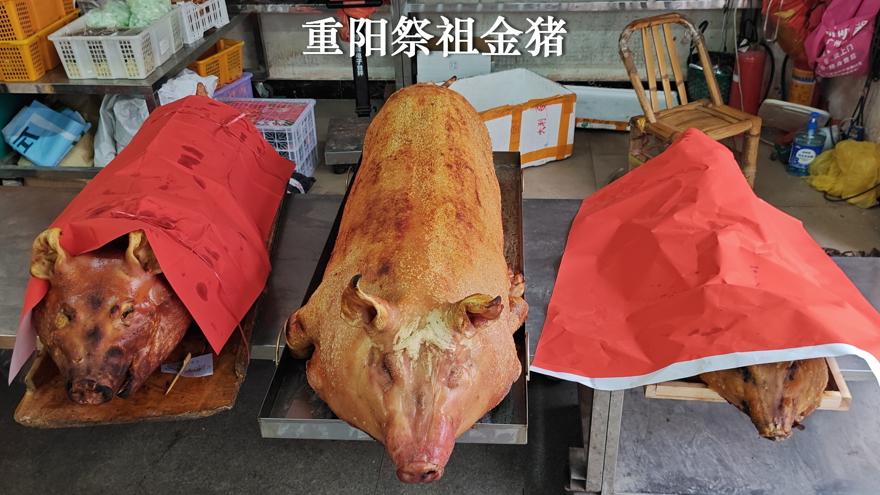 一进市场,看到三只大烧猪,旁边当地人都在大量采购民俗纸制品,肯定是集体祭祖活动了。重阳祭祖是客家人的重大传统,现在重阳节刚过不久,今天是农历九月十二,正逢周末,怪不得有那么多人采购祭祖物品。