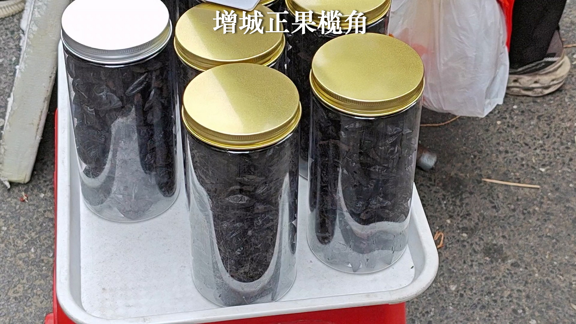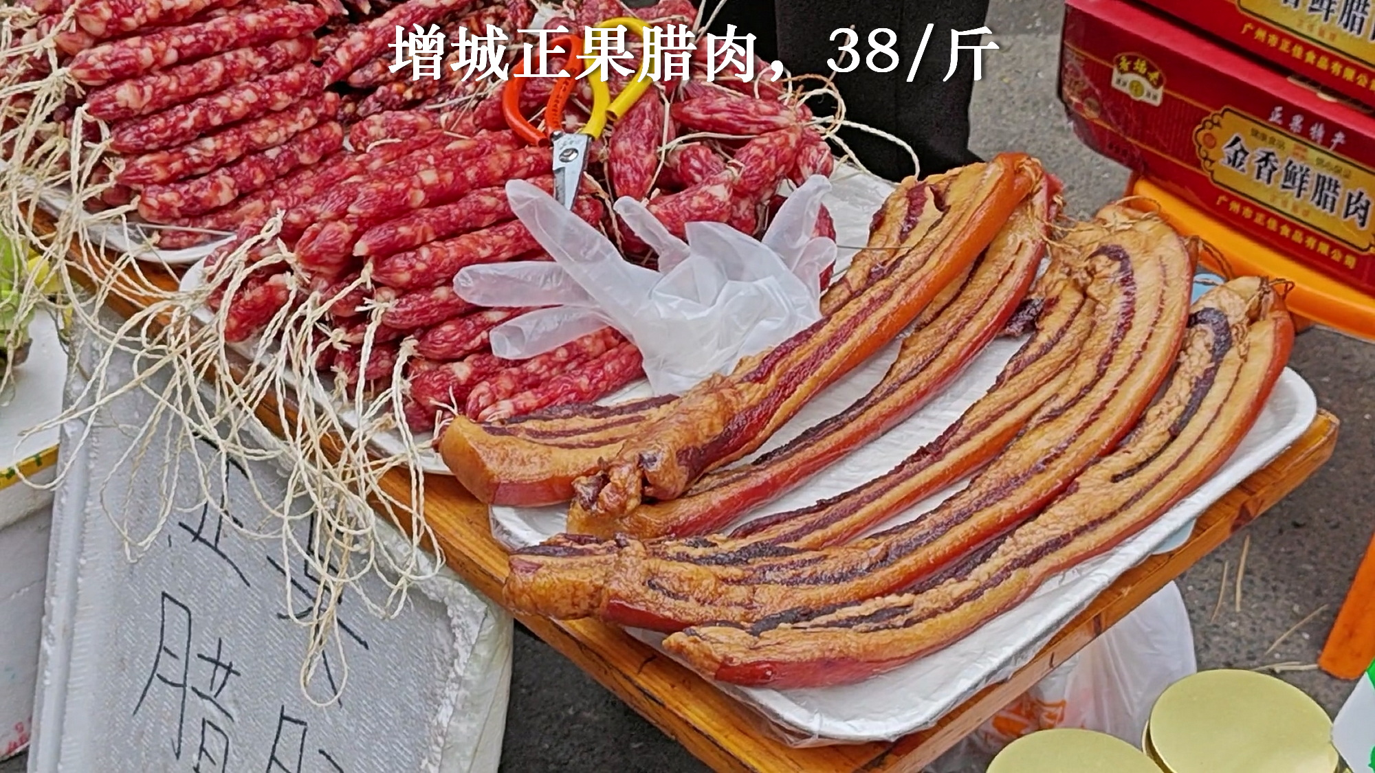 2、另外有档正果腊味,正果腊味很有名。腊肠是45一斤,看着不错,腊肉没问,就当是38一斤吧,都很好。另外还有增城正果的榄角,正果榄角也非常有名。