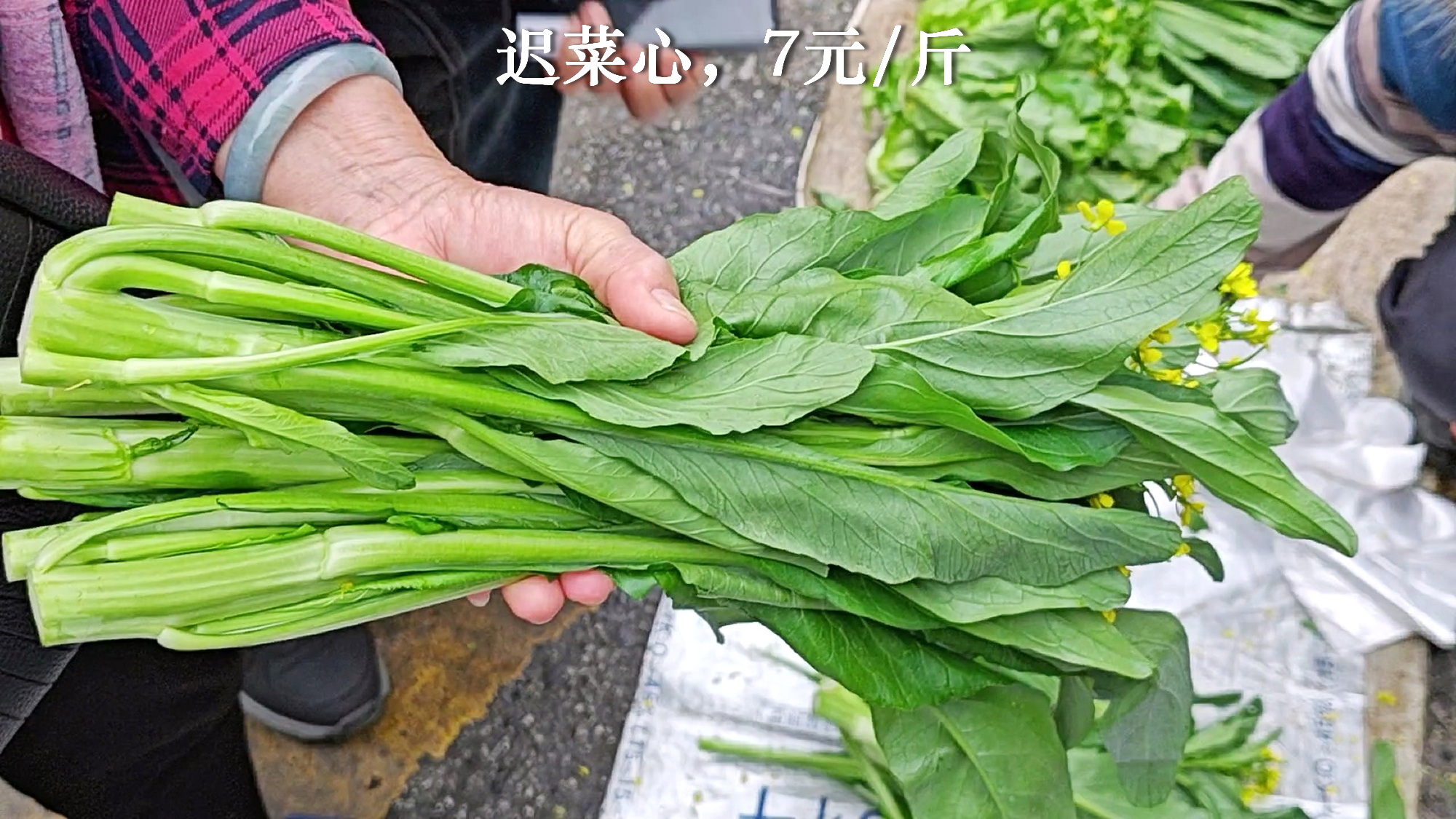 1、迟菜心:迟菜心已经有不少,统一价格是7元一斤。大部分都是鹩哥脷,叶子是尖的。圆叶的迟菜心有一两家在卖,刚拿出来就被抢完了。现在天气不够冷,还不是迟菜心的正季,但市区基本没得卖。