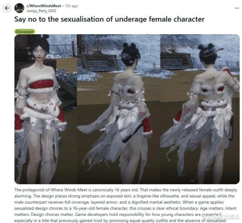 皮肤一曝光,立刻点燃了国内社区,尤其是大量女性玩家的怒火。核心指控就一个:男凝(男性凝视)。大家觉得这套装扮完全是在物化女性,为了吸引男性玩家而刻意暴露,跟游戏标榜的武侠气质和之前女性友好的承诺背道而驰。评论区直接被周年庆变头七的嘲讽刷屏。