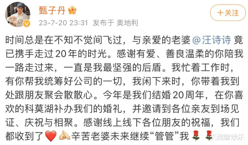 字里行间都看出甄子丹对爱妻的宠溺和爱慕,相守20年还能一如既往的不变初心,不只是在娱乐圈,在所有情侣当中都实属难得。