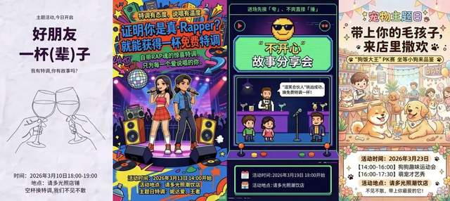 如果说有趣的外壳是吸引观众驻足的开端,那么情绪的共鸣就是《风华合伙人》留住人心的内核。在“悦己经济”的浪潮下,年轻人消费的不再仅仅是产品,更是情绪价值带来的附加满足感。节目精准捕捉到了这一时代的情绪,以“微醺治愈”为情绪锚点,以“悦己+兴趣社交”为立意,将潮饮店定义为一个“城市客厅”,通过策划各类主题日活动,打造潮流多元的主题特调派对,在潮流属性与社交属性的双重叠加下重构年轻人的悦己场景,用“情绪价值共鸣”完成悦己闭环。