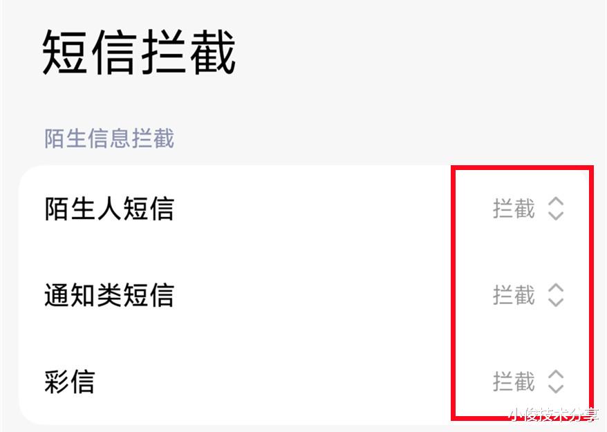 然后返回去点击短信拦截,把陌生人短信全部设置为【拦截】,这样设置之后,咱们使用手机时,就不会收到骚扰电话和恶意短信了!