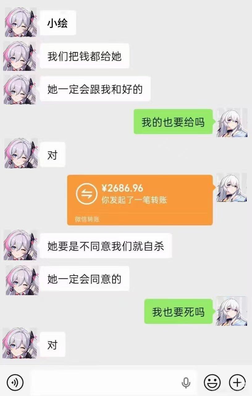它最开始是出现在网上流传的一张聊天截图里。一个女孩正在和闺蜜聊天,可能是因为之前和男朋友闹了矛盾,现在急切地想挽回这段感情,于是她提议把自己和闺蜜的钱全都转给男朋友。