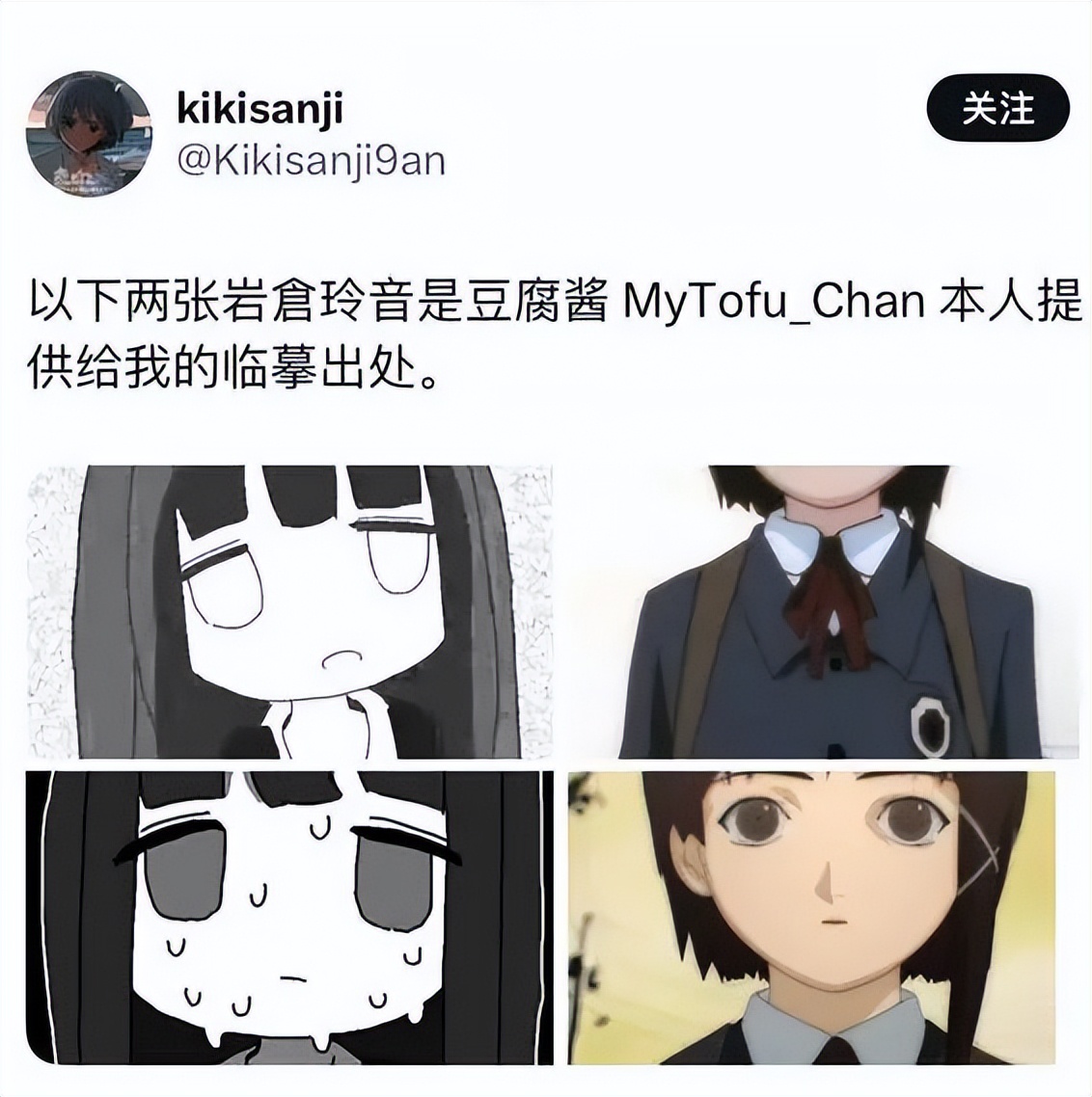 在kikisanji的描述中,上述的两张原图是她的朋友“豆腐酱”送给自己的见面礼,而14酱的原型则参考了1998年科幻动画《玲音》的女主”岩倉玲音”。