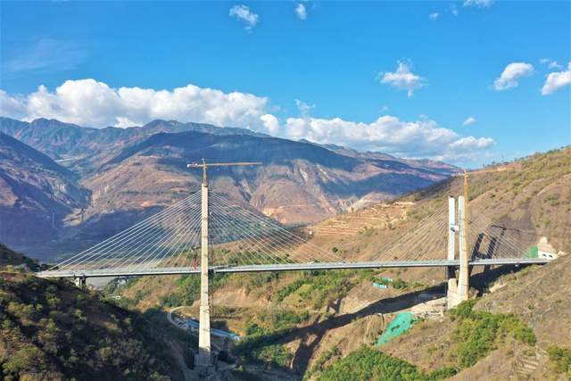 金沙江特大桥横跨金沙江,连接川滇两省,是国内在建最大跨度P-K钢箱混合梁独塔斜拉桥,大桥主塔高197.6米,全长565米,主跨跨径340米,采用双向4车道高速公路设计标准,设计时速80公里。金沙江特大桥是G7611国高网都香高速公路的控制性重难点工程,是连接川滇两省的又一新地标,进一步推进川滇黔三省经济融合发展,提高滇东北交通运输主动脉等级,对打造云南境内东西向最具魅力的黄金旅游线,推动西南地区高质量发展具有重要意义。