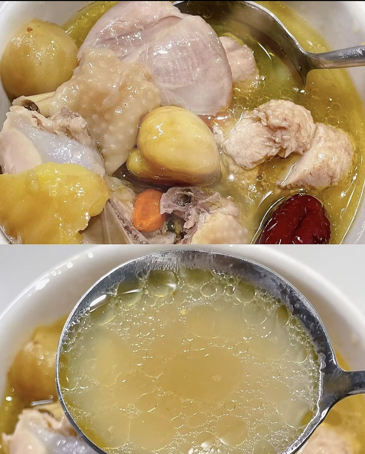 判断鸡汤炖好没炖好,有三个标准:一是鸡肉能轻松用筷子撕开,二是汤色呈现漂亮的金黄色,三是满屋子都是浓郁的鸡香。炖好后,先别急着喝,关火盖上锅盖,让鸡汤焖十到十五分钟,这叫"回魂",能让味道更融合。最后只需要加一点点盐提味就够了,千万别加多了,抢走了鸡汤本身的鲜味。盛汤的时候,我喜欢先舀汤再夹肉,碗底放几颗枸杞和红枣做点缀,热气腾腾端上桌,那感觉,简直比米其林大餐还幸福!