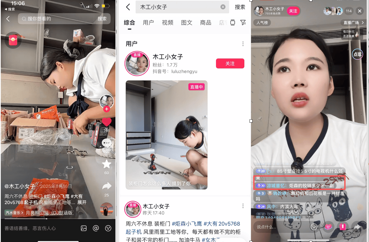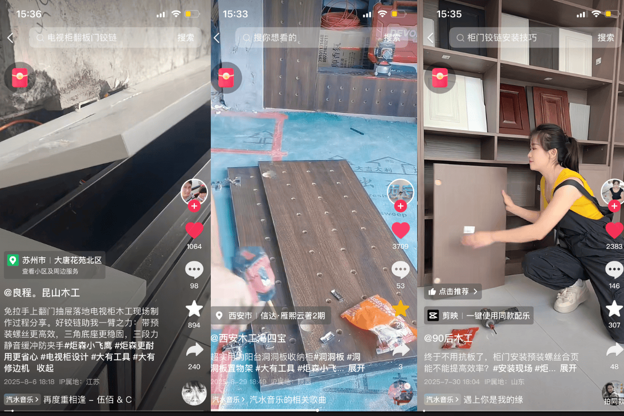 直播预热与直播互动:KOC提前预告直播时间,并在直播中真实演示安装全过程。与传统的带货直播不同,这类直播更像是专业教学和技术分享——达人一边安装柜门铰链,一边讲解施工技巧,同时回答观众提问。产品植入自然而然地融入专业内容中,观众在不自觉中建立对品牌和产品的信任。