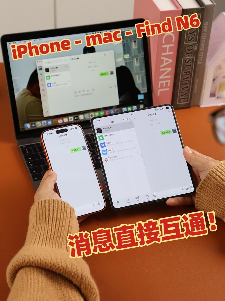 之所以这么说是因为我最近发现!OPPO Find N6居然能和iPhone 17 Pro消息互通,不仅能两台手机+一台电脑三个设备同时登录同一个微信,还能直接接到iPhone上的电话,都不怕错过重要的工作信息!瞬间我就决定出门只带OPPO Find N6就行了~