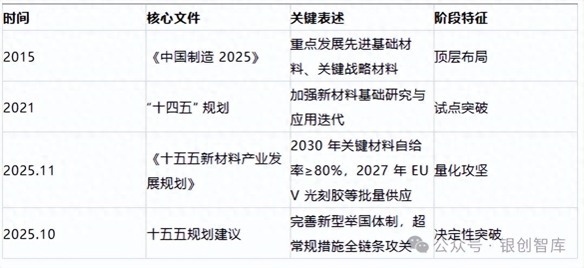 十五五将先进材料列为与集成电路、工业母机并列的核心攻关领域,定位为新质生产力的物质基础,通过“全链条一体化攻关”破解“材料 - 装备 - 工艺” 协同壁垒,政策力度空前。