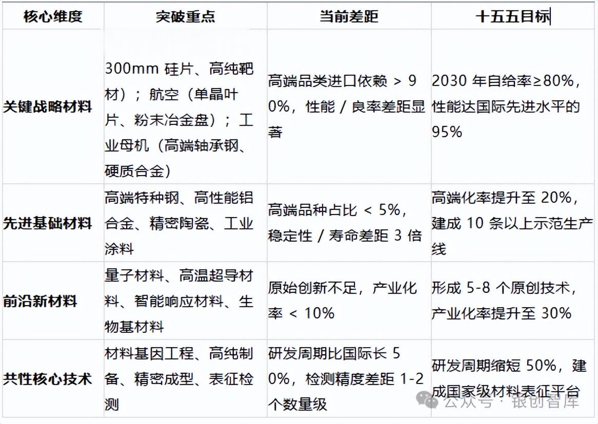核心结论:十五五以新型举国体制 + 超常规措施推动先进材料从 “单点突破” 走向 “全链条自主可控”,构建 “先进基础材料筑基、关键战略材料攻坚、前沿新材料布局” 三维体系。核心突破聚焦半导体材料、航空航天材料、工业母机配套材料三大 “卡脖子” 领域,2030 年关键材料自给率目标≥80%,国产替代空间超5倍。
