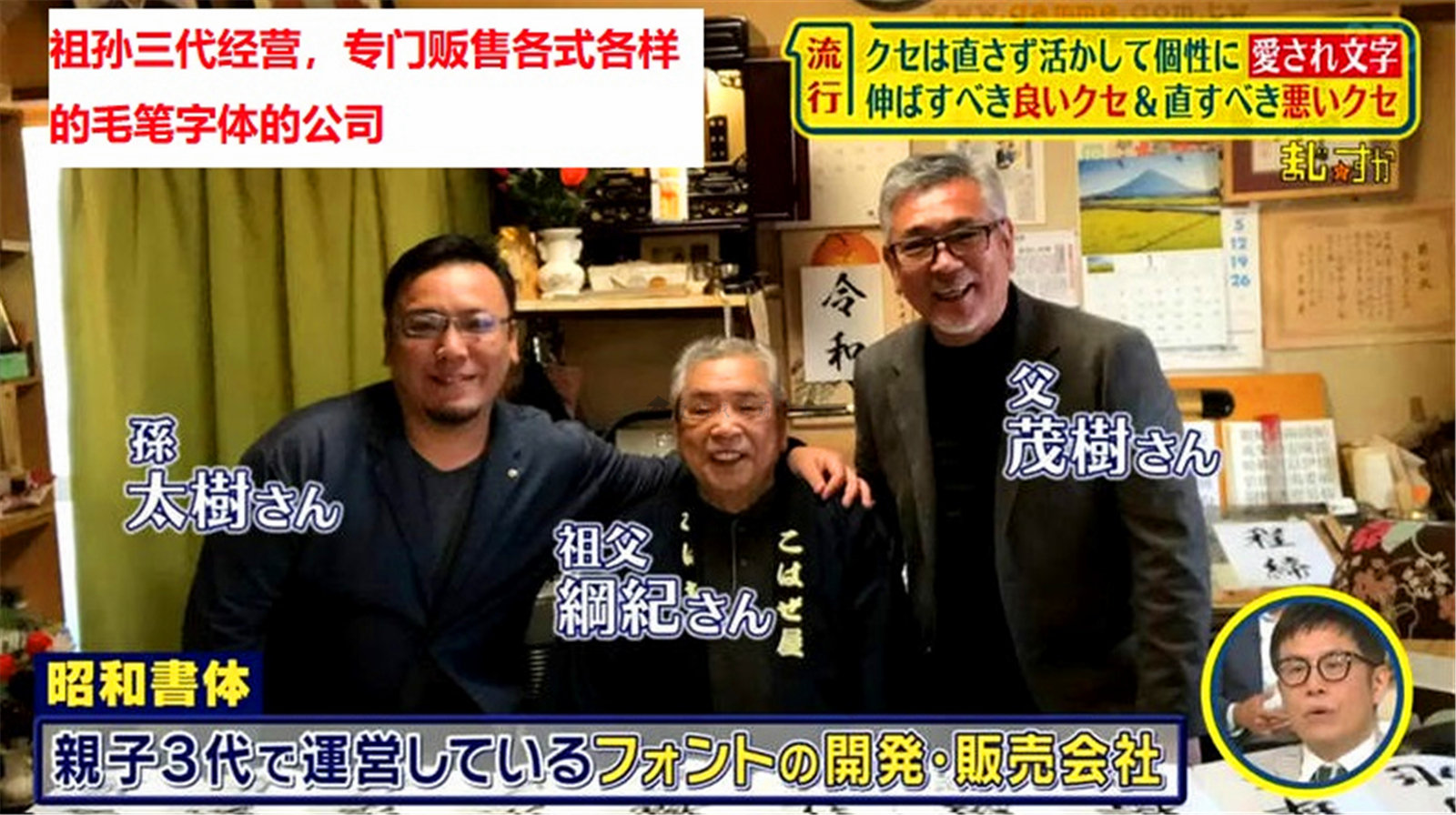 在节目组的牵线搭桥之下,中丸雄一访问到一间名叫“昭和书体”的字体公司。这是一间祖孙三代经营,专门贩售各式各样的毛笔字体的公司。公司里贩卖的毛笔字体都是由85岁的爷爷坂口纲纪亲自发明,并且一个字一个字写出来的!至于其他员工,则是把老人家写的字转化为电脑字体,然后有偿授权给其他人使用。他们家的毛笔字体多达数十种,广泛运用于动画、漫画、游戏和商品包装中。