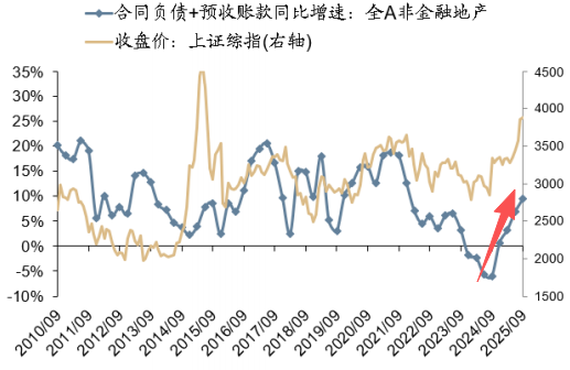 下图蓝线是过去15年A股(不含金融地产)合同负债的同比增速。黄线是上证指数走势。
