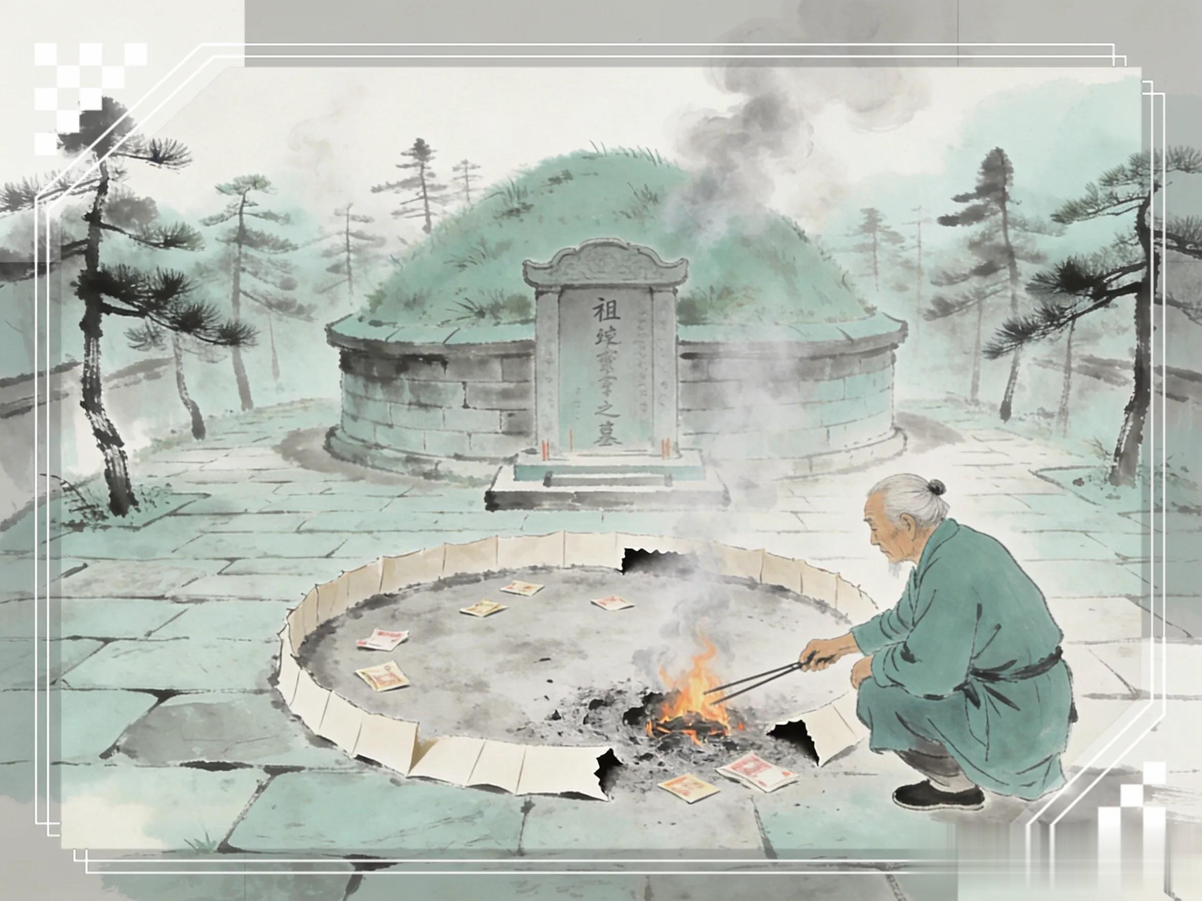 五、烧纸画圈,为什么必须留一个“缺口”?扫墓时,烧纸画圈本为防外鬼争抢,但画圈不能画死。