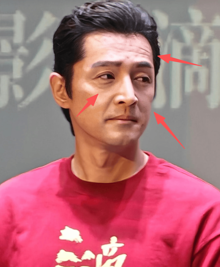 他的脸部轮廓也变得有些崎岖,侧脸看颧骨格外突出,而面中却显得干瘪。深刻的法令纹异常醒目,但转到正面,两颊到下颚一带又异常圆润,这种上削瘦下发福的观感,让脸部线条极不协调。