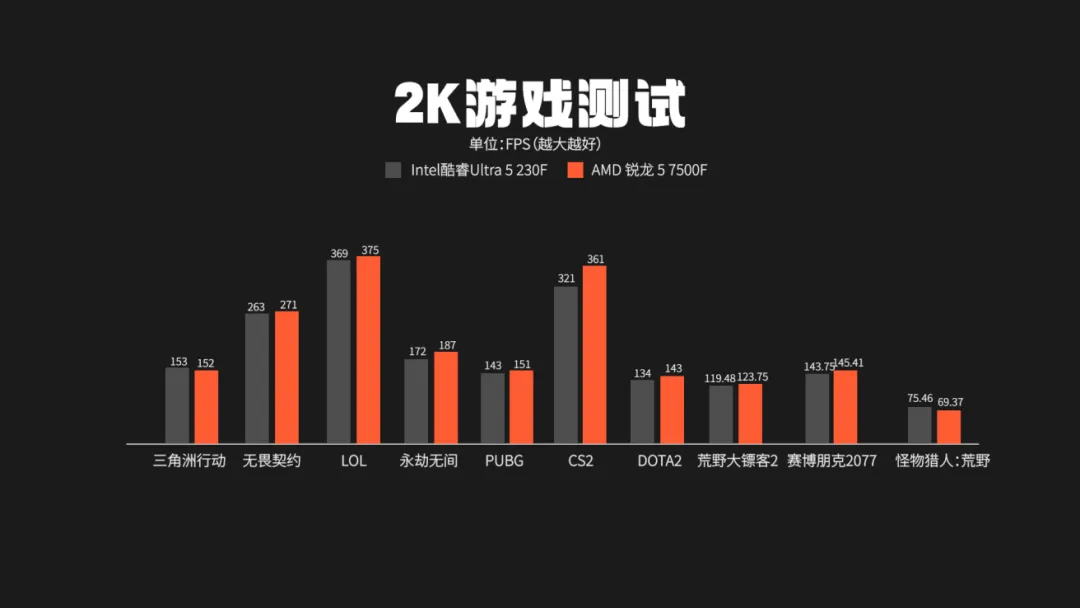 不过,当分辨率提升至2K时,显卡成为影响游戏流畅度的主要因素,在相同GPU配置下,两块CPU的差距不再像1080P时那样明显。在这类高分辨率下,CPU更多的是承担数据处理和任务调度的角色,而显卡则决定了游戏的渲染性能。尽管实际体验差别不是特别大,但是在众多3A大作中,锐龙5 7500F的平均帧数依然可以小胜230F。