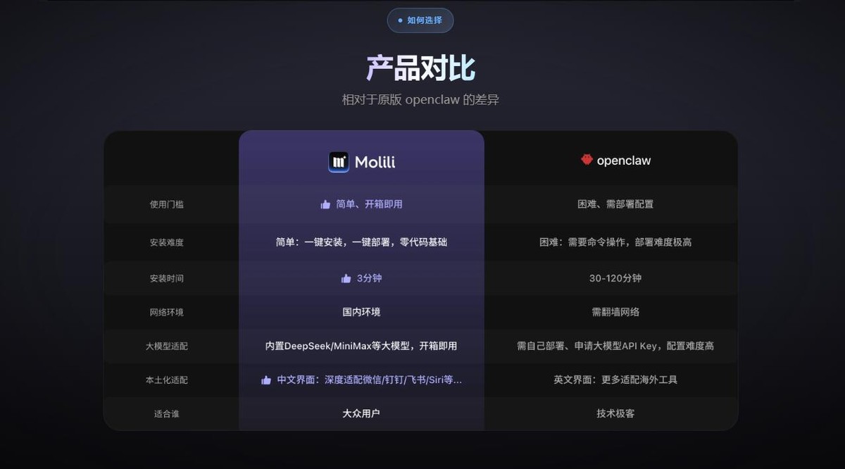 寻找词元消耗低的 Agent。推荐这款国内首个 OpenClaw 中文版:当贝Molili(www.molili.com.cn)。内置国内主流模型 Kimi、MiniMax、DeepSeek。核心优势显著。相比原版OpenClaw,吞噬词元的无底洞,Molili的低词元消耗优势可谓显著!
