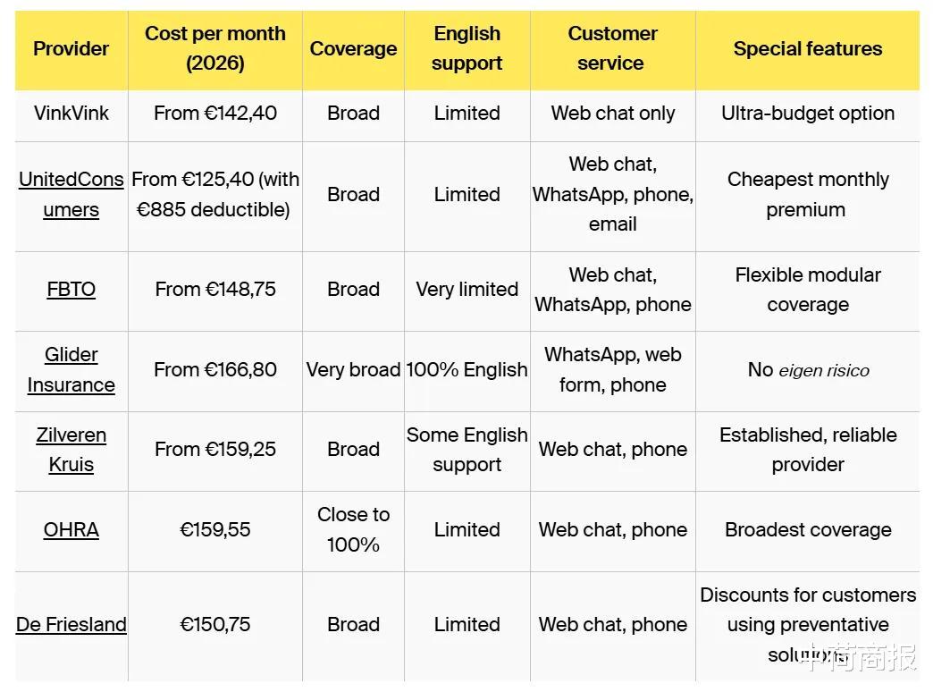 特殊功能或福利最后,一些公司提供额外福利,如预防健康项目、远程医疗App或免除自付额(eigen risico)等。我们也会突出说明让某家公司脱颖而出的特色。