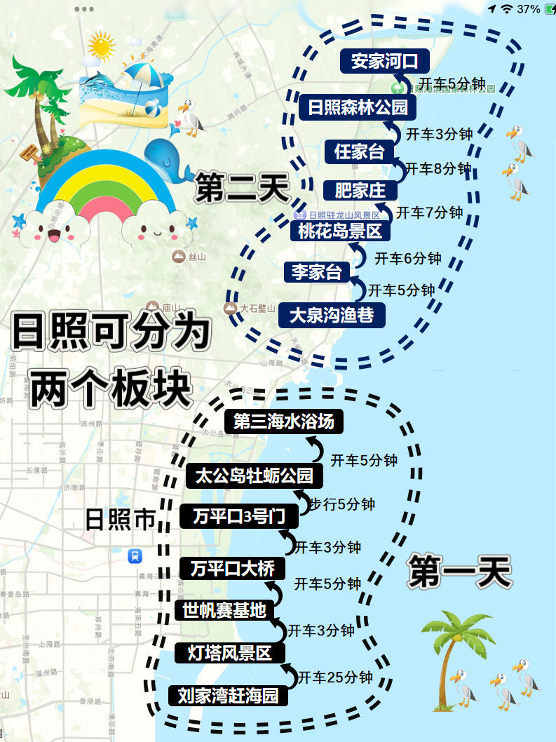 今年跨年就去日照了,不仅可以看海还能放烟花,自己花费了好几天总结手绘了这份手绘地图,计划去的可以参考了😀