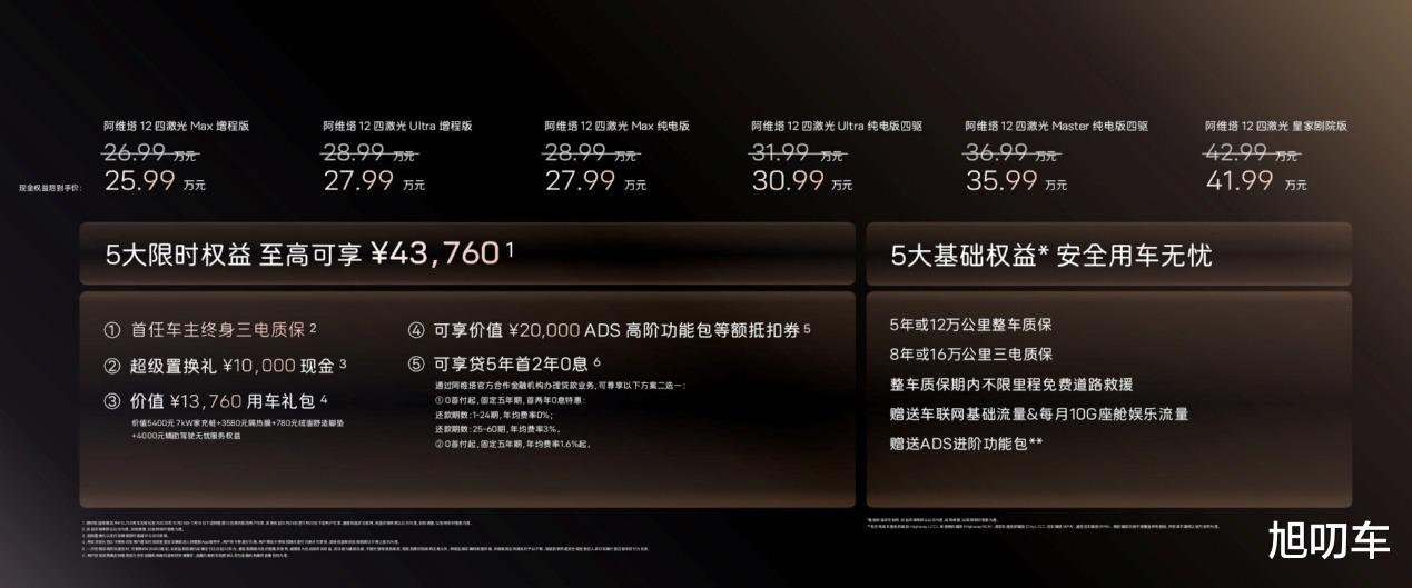 2025年10月28日,阿维塔12四激光版正式上市,官方指导价为26.99万元-42.99万元,权益后到手价为25.99万元-41.99万元。