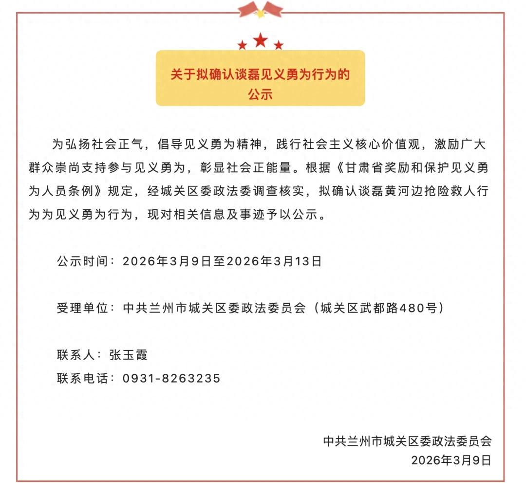 3月9日,甘肃省兰州市城关区政法委发布《关于拟确认谈磊见义勇为行为的公示》,拟确认谈磊黄河边抢险救人行为为见义勇为行为,并对相关信息及事迹予以公示。