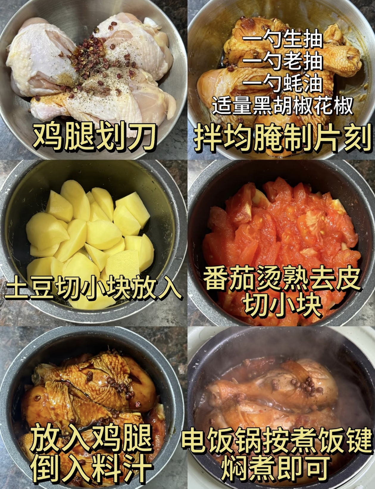 食材准备好后,就可以把它们依次放进电饭煲里了。先在电饭煲的底部铺上切好的土豆块,土豆垫底既能防止鸡腿粘锅,也能吸收鸡腿和番茄的汤汁,变得软糯入味;接着铺上切好的番茄块,番茄炖软后会出汁,刚好能代替清水,让整道菜的汤汁更浓郁鲜甜;最后把腌制好的鸡腿摆在上面,再把碗里剩下的腌料全部倒进锅里,不用额外加清水,番茄和鸡腿炖出的汁水就足够了。盖好电饭煲的盖子,按下煮饭键,剩下的就交给时间慢慢焖煮。等待的过程中,厨房里会渐渐飘出肉香混着番茄的酸甜味,让人忍不住频频往厨房跑,等煮饭键第一次跳起来的时候,别急着开盖,再焖个十分钟,让鸡腿和土豆的味道再融合一会儿,也能让鸡腿炖得更软烂。