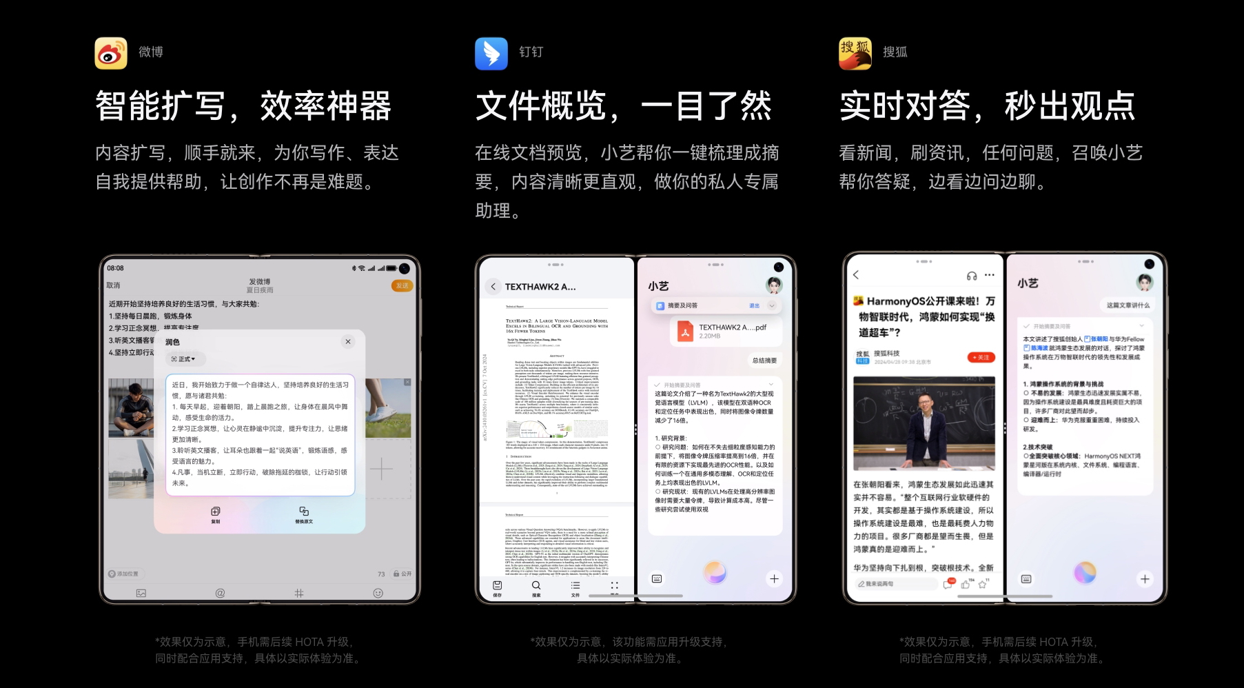 与此同时,鸿蒙5的加持让AI不再是独立功能,而是深度融入系统底层的核心能力。其中全新升级的“小艺”针对折叠大屏深度优化,可在需要时主动触发智慧分屏。例如阅读外文文档时,一键唤醒小艺即可实时翻译并左右对照显示,一目了然。此外,它更能根据内容生成图表、提炼摘要,甚至智能扩写微博文案,带来全方位的智慧辅助。
