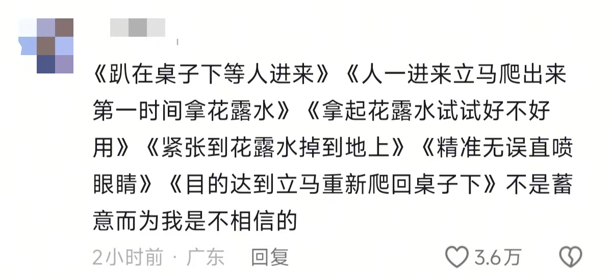 也有人数着她的每一步:“趴在桌下等人→人来爬出来拿→试喷头→喷眼睛→躲回去”,直言 “说不是蓄意我不信”。