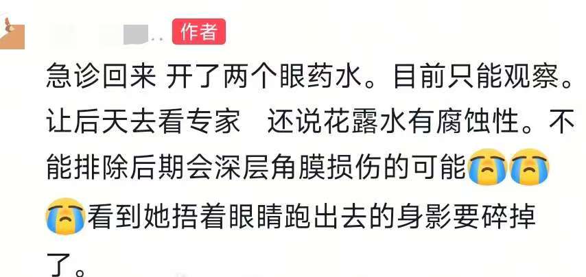 检查后,医生开了两瓶眼药水,语气凝重地跟妈妈说:“花露水含酒精和香精,对幼儿娇嫩的眼部黏膜有强刺激性,现在只能先用药缓解,后天必须来查是否有角膜损伤。”