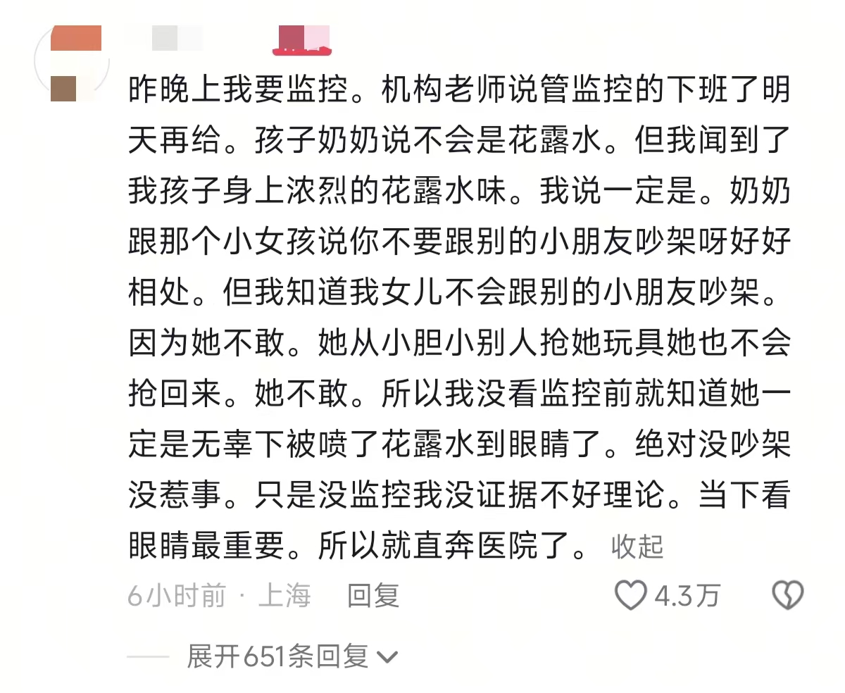 可等她刚刚靠近,姐姐突然把花露水举到眼前,喷头稳稳对准妹妹的眼睛,“嗤” 的一声,液体直接喷在了孩子娇嫩的眼周。