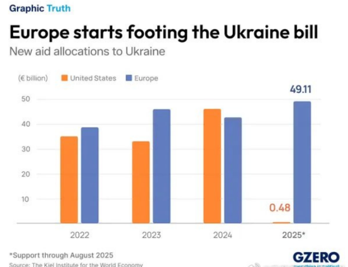 从上表中可知,过去3年,除了2024年,欧洲的援助都超过美国。尤其是今年,欧洲援助了490.1亿美元,美国只给了4.8亿美元,都是拜登时代留下的。