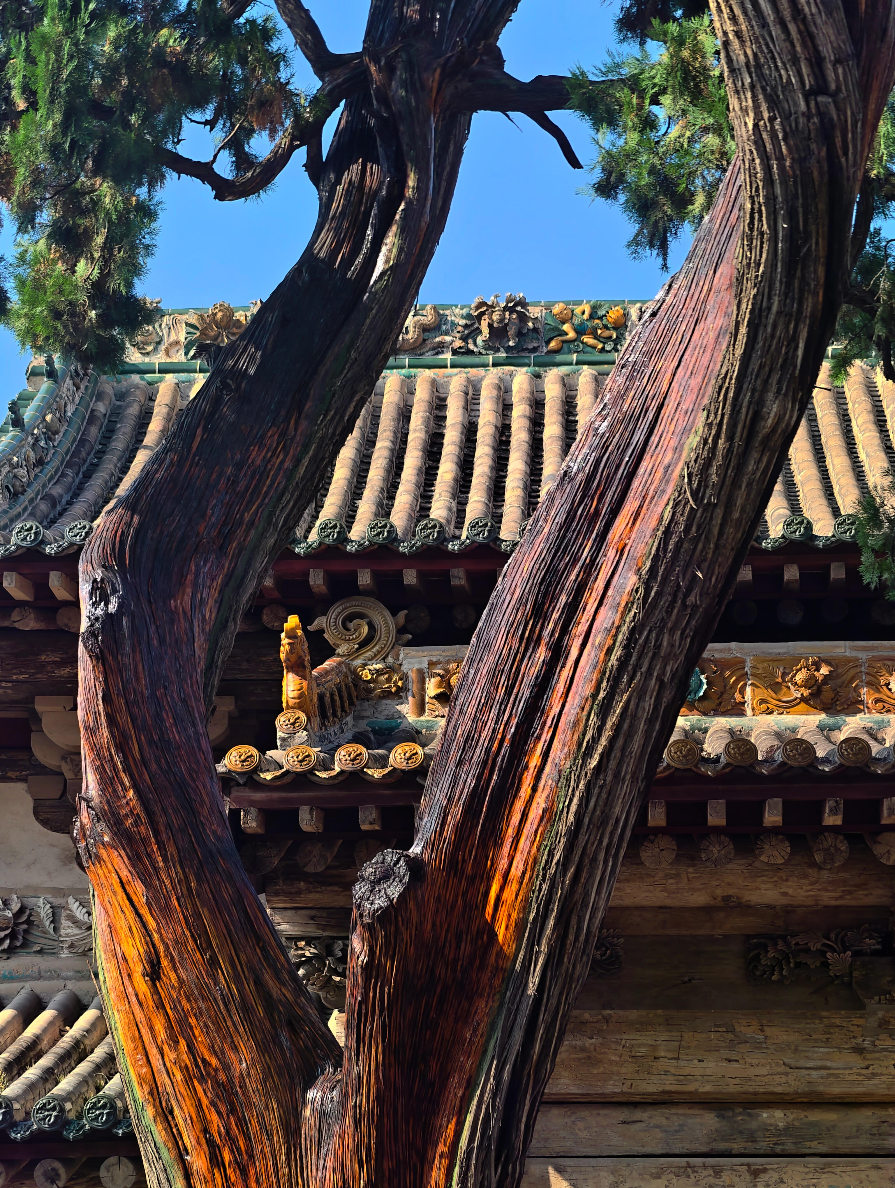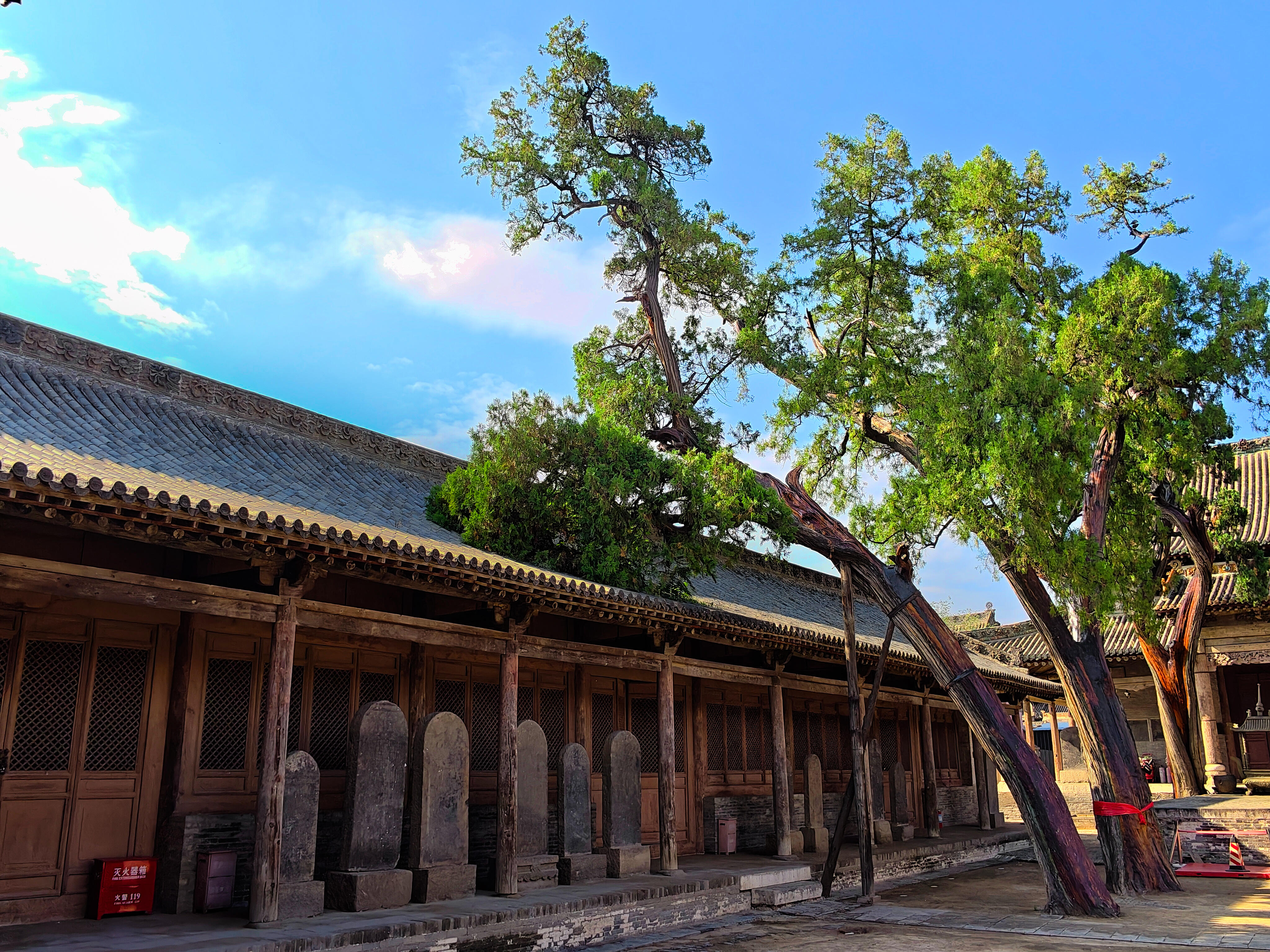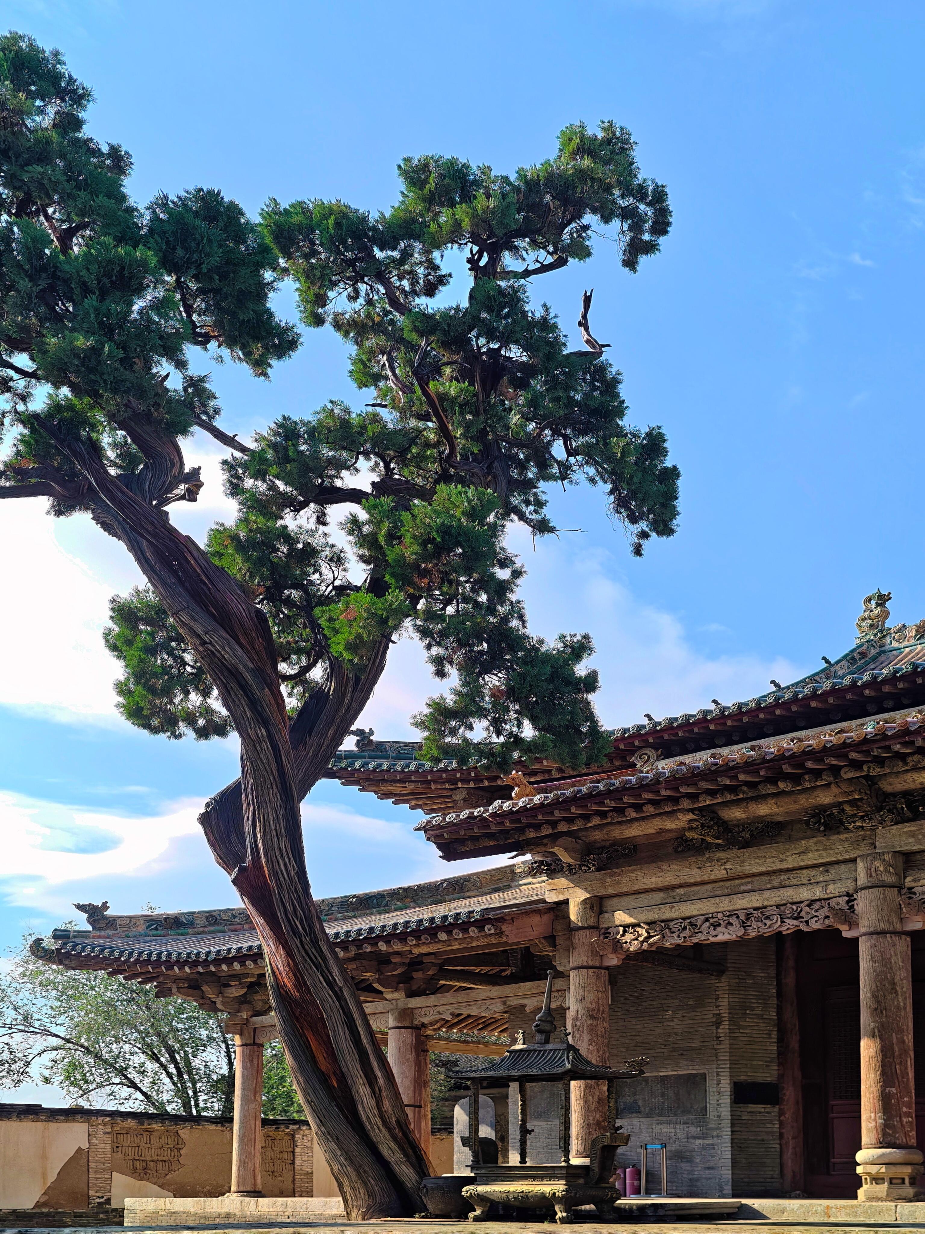 最先抓住目光的是院子里的古柏,不是一两株,是沿着院墙根排开的十几株,每一株都粗得要两个人才能合抱。树干上的纹路深得像刀刻,有的地方还留着雷击的疤痕,可枝叶依旧茂盛,翠绿的叶子层层叠叠,把阳光剪成细碎的光斑,落在青砖地上,像撒了一把碎金子。最老的那株在关帝庙前,树干歪着,却依旧挺拔,枝桠斜斜地伸到殿宇的飞檐上,像是在和屋顶的脊兽悄悄说话。我伸手摸了摸树干,粗糙的树皮蹭得手心发痒,仿佛能摸到时光的纹路——这棵树在这里站了几百年,见过多少人来人往,又听过多少故事,现在却安安静静地陪着空无一人的庭院,把所有过往都藏进年轮里。