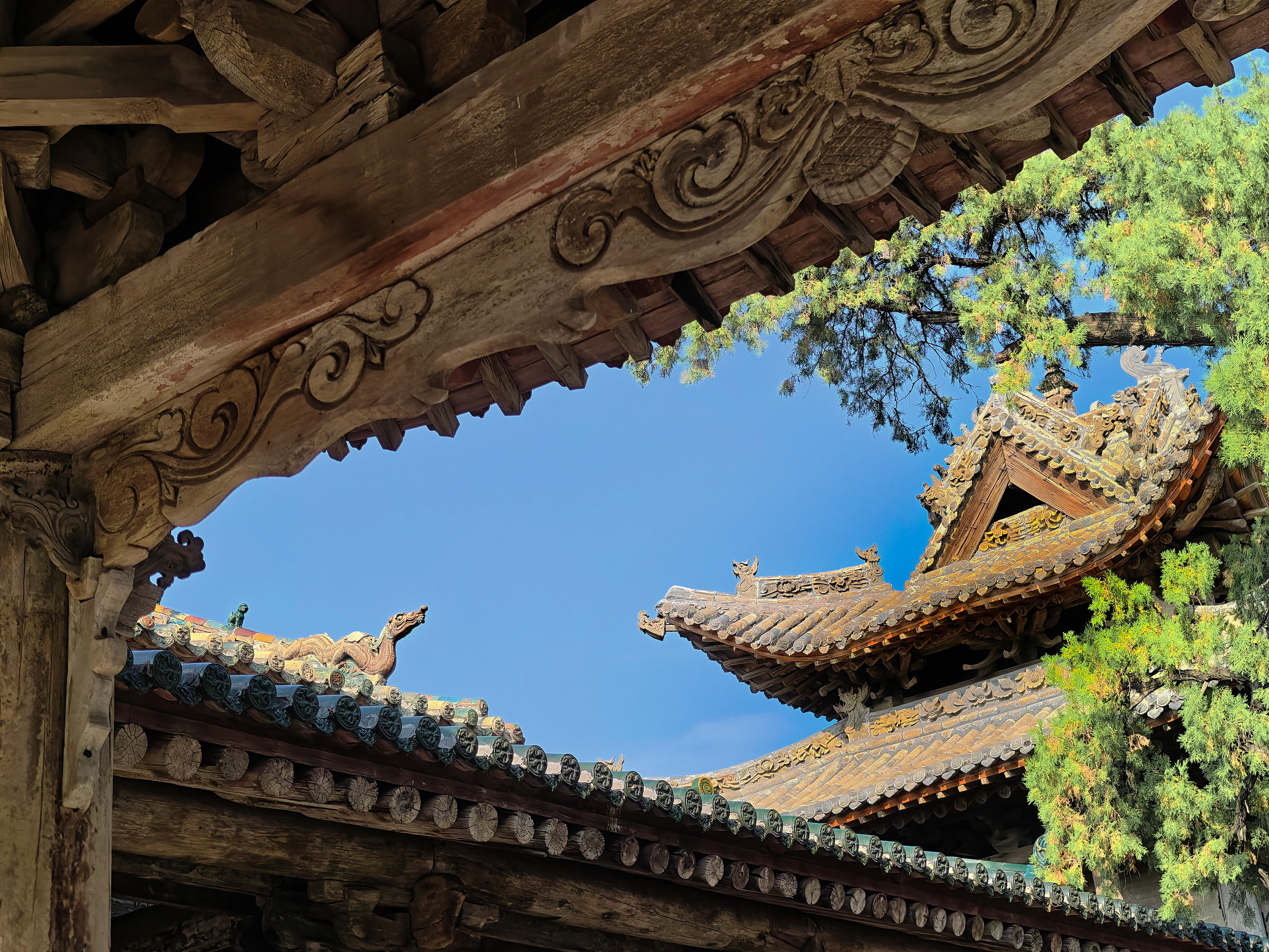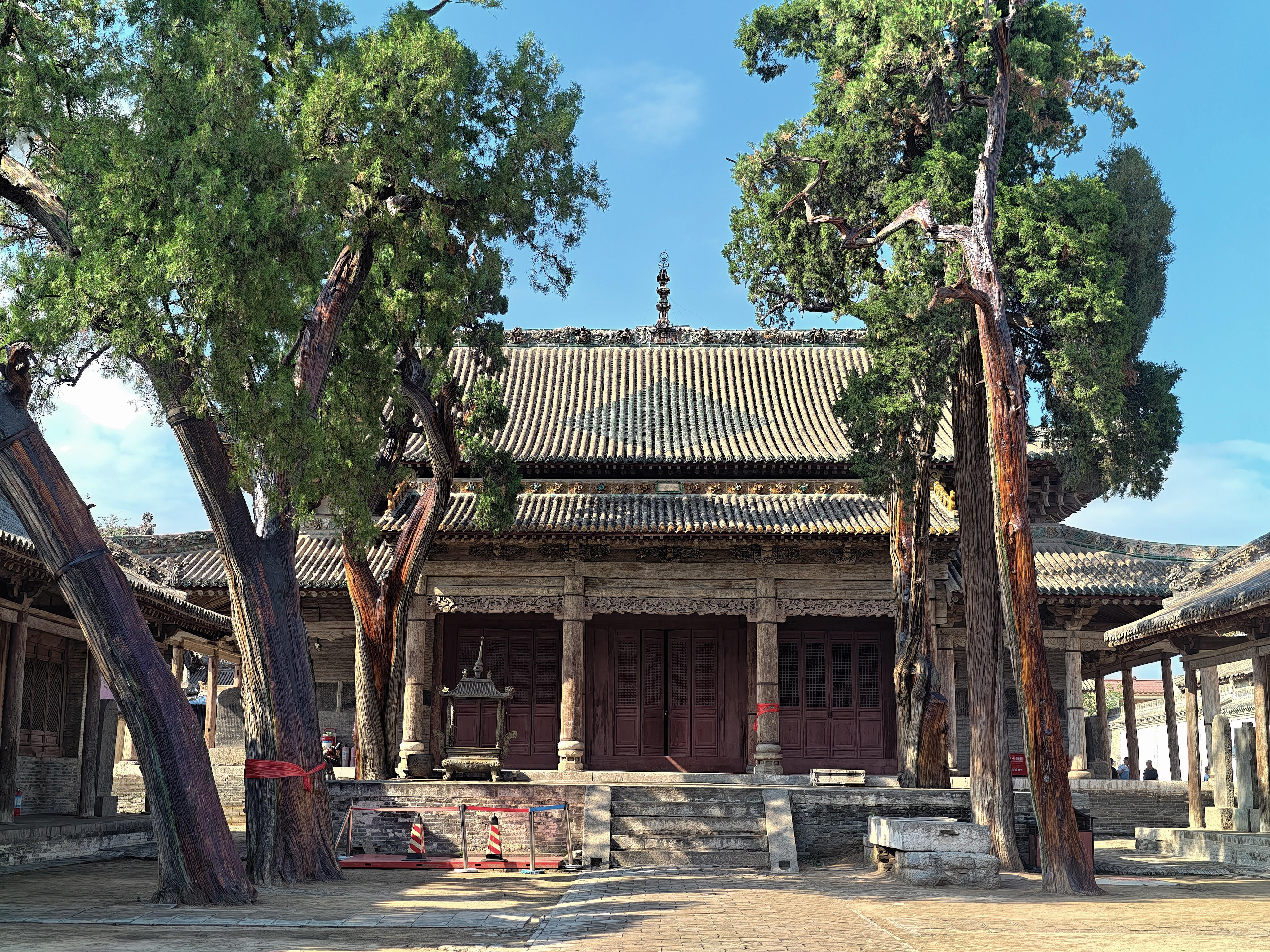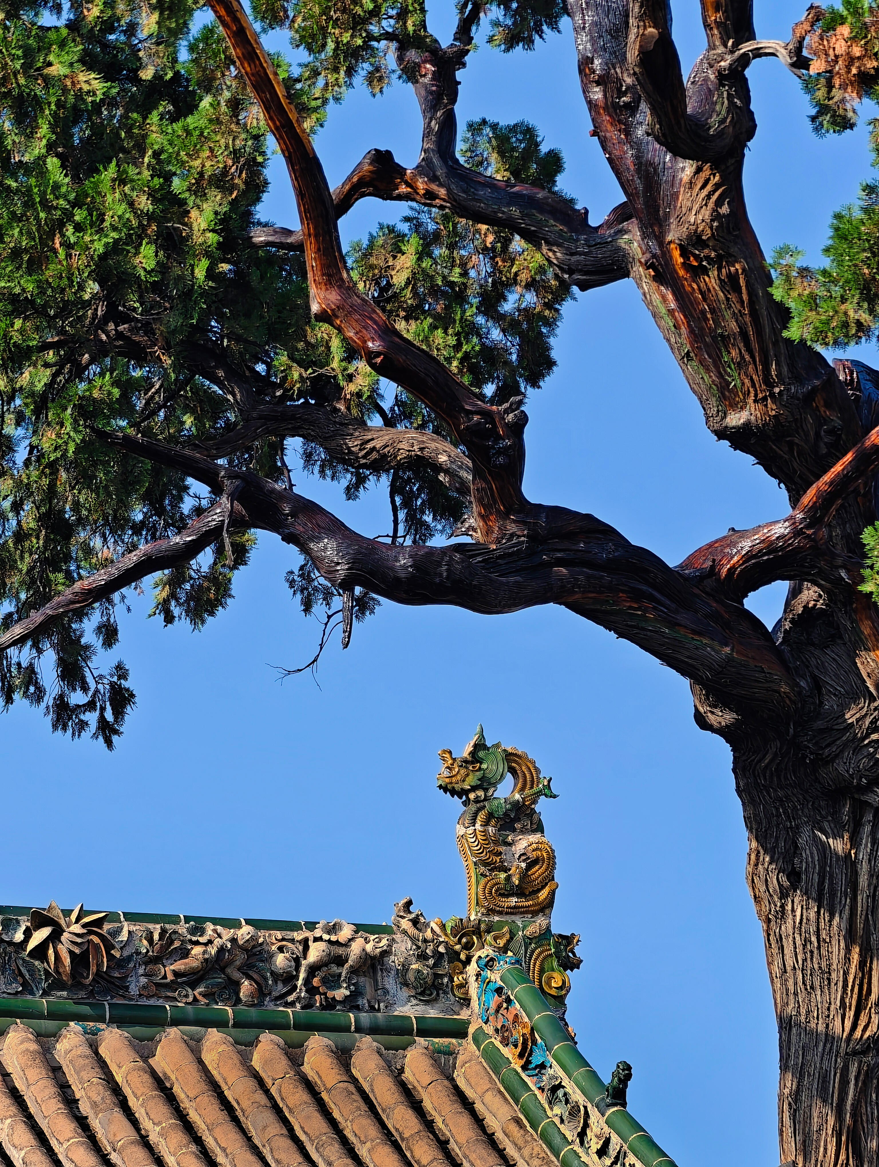 最先抓住目光的是院子里的古柏,不是一两株,是沿着院墙根排开的十几株,每一株都粗得要两个人才能合抱。树干上的纹路深得像刀刻,有的地方还留着雷击的疤痕,可枝叶依旧茂盛,翠绿的叶子层层叠叠,把阳光剪成细碎的光斑,落在青砖地上,像撒了一把碎金子。最老的那株在关帝庙前,树干歪着,却依旧挺拔,枝桠斜斜地伸到殿宇的飞檐上,像是在和屋顶的脊兽悄悄说话。我伸手摸了摸树干,粗糙的树皮蹭得手心发痒,仿佛能摸到时光的纹路——这棵树在这里站了几百年,见过多少人来人往,又听过多少故事,现在却安安静静地陪着空无一人的庭院,把所有过往都藏进年轮里。