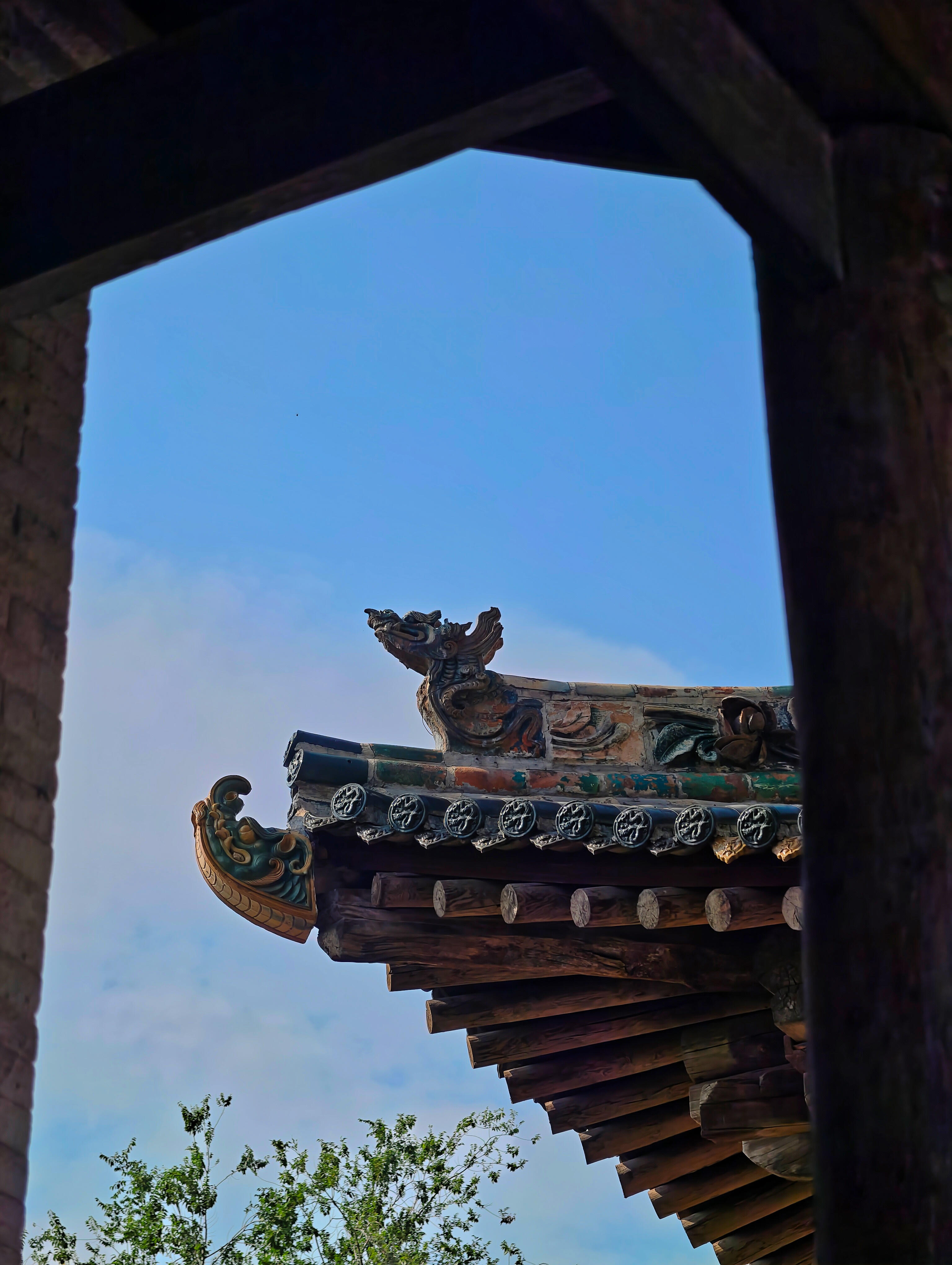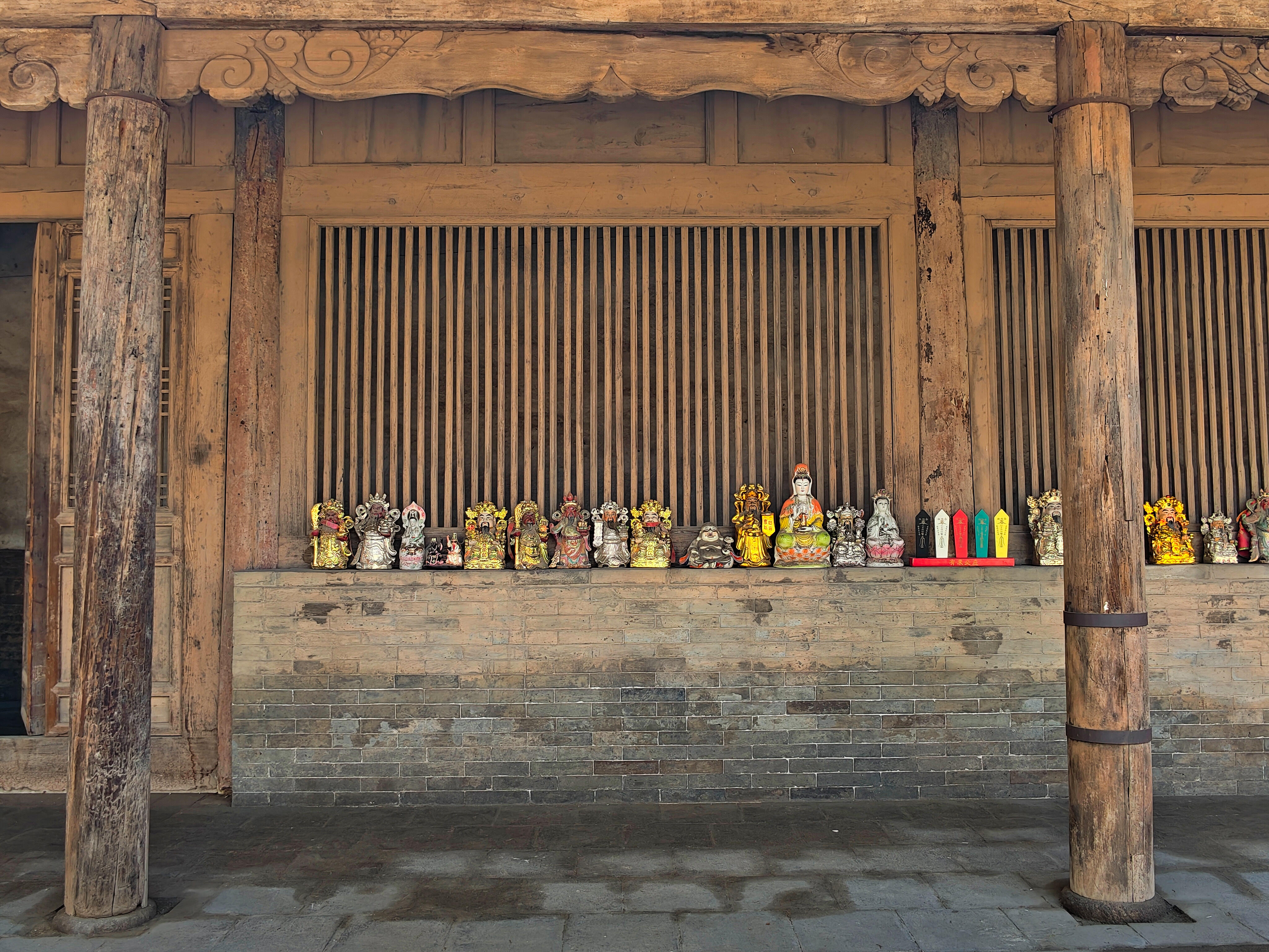 顺着柏树荫往深处走,就看到了城隍庙的大殿。殿门是朱红色的,颜料已经剥落了大半,露出下面的木头纹理,可门上的铜环依旧亮得发光,想来是偶尔有人来,忍不住摸一摸。推开门进去,殿内更静,只有阳光从窗棂的雕花里透进来,在地上投出好看的图案。抬头看梁架,上面的彩画虽然褪色了,却依旧能看清图案:缠枝莲的线条流畅,凤凰的尾羽舒展,连角落里的云纹都刻得极细致。最妙的是殿内的立柱,柱础上雕刻着莲瓣,每一片莲瓣都带着细微的弧度,像是刚从水里捞出来,还沾着水汽。我轻轻敲了敲柱子,木头发出沉闷的响声,像是在回应——这里没有导游的讲解声,没有游客的喧闹声,只有建筑本身在说话,用斑驳的墙面,用褪色的彩画,用粗糙的柱础,诉说着它见过的岁月。