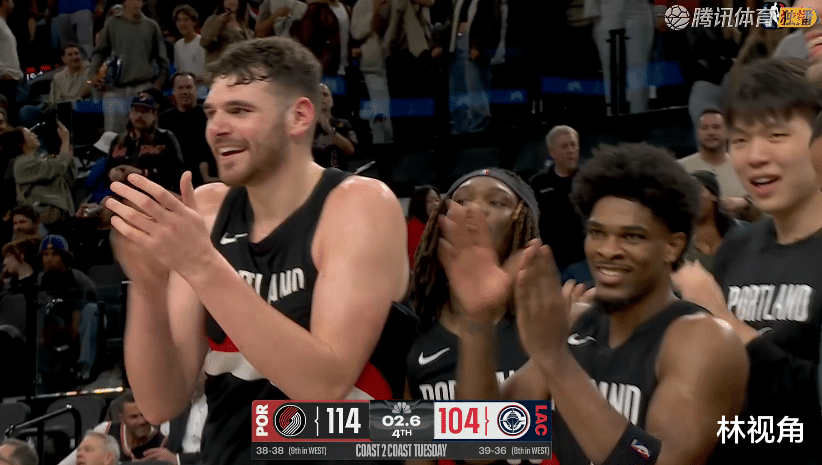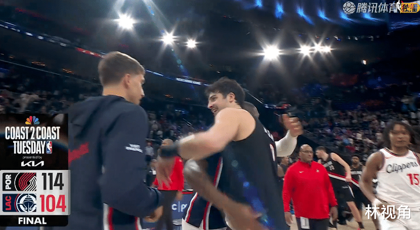 开拓者这边小杨在场边很开心,和队友击掌庆祝胜利,阿夫迪亚走入场内,和博格丹拥抱致意,两人私交不错,在场上聊了起来。