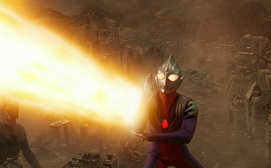 小悠躲在便利店的货架后,浑身颤抖地看着玻璃墙外的怪兽。它的巨爪轻易掀翻了一辆公交车,火焰映照着怪兽口中凝聚的紫色光球。就在光球即将发射的瞬间,一道银色光芒从天而降,撞碎了致命的攻击。迪迦奥特曼的身影在火光中显现,他标志性的复合型身姿在雨夜中划出凌厉的弧线,一拳轰向怪兽的头部。