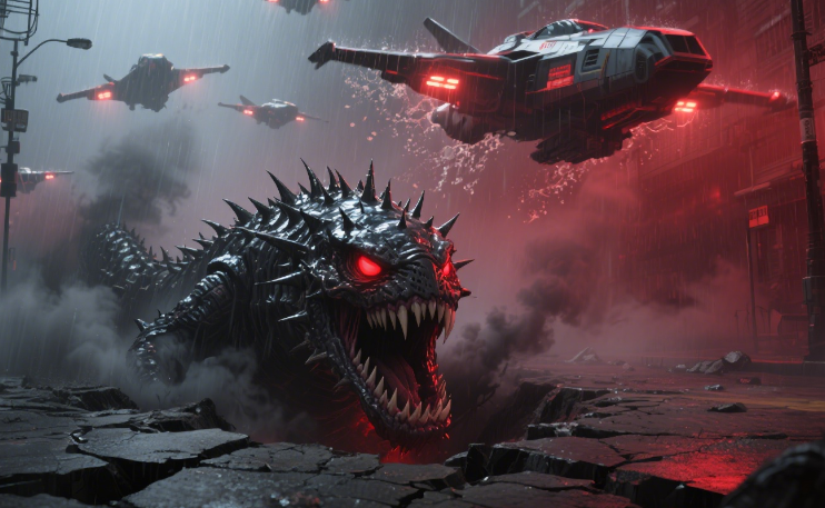 当胜利飞燕队的战机划破雨幕时,地面的景象让所有人瞳孔骤缩。暗红色雾气中,一只布满尖刺的巨型怪兽破土而出,它的皮肤泛着诡异的金属光泽,每走一步,地面就会裂开蛛网般的缝隙,涌出更多黑雾。“这是... 加佐特的进化体?不,能量波动完全不同!” 队员新城盯着雷达,声音里带着难以掩饰的恐惧。