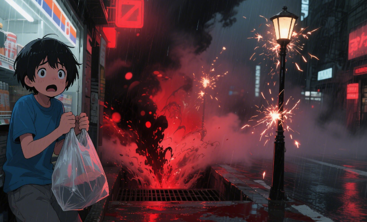 深夜的霓虹市,霓虹灯在骤雨中扭曲成血色光斑。12 岁的小悠攥着便利店的塑料袋,看着雨水在柏油路上汇成诡异的黑色溪流。突然,下水道传来金属扭曲的尖啸,路灯接连爆裂,暗红色的雾气从地底喷涌而出,将整条街道笼罩在一片混沌之中。