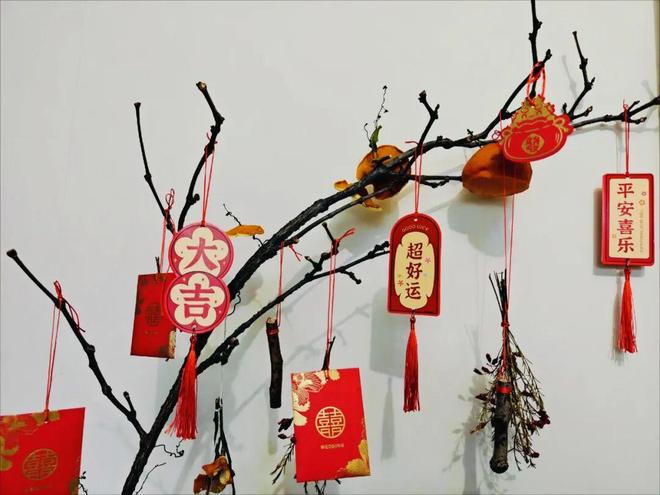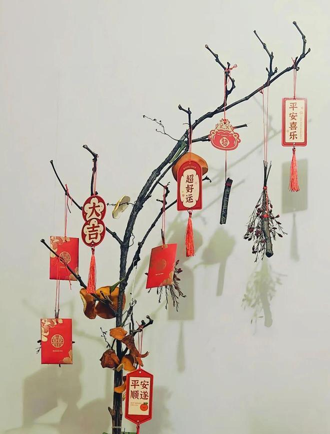 方法很简单,只需要把树枝清洗干净,用红绳系上红包、福牌、晒干的橘皮以及一些象征平安、喜庆的物品即可。