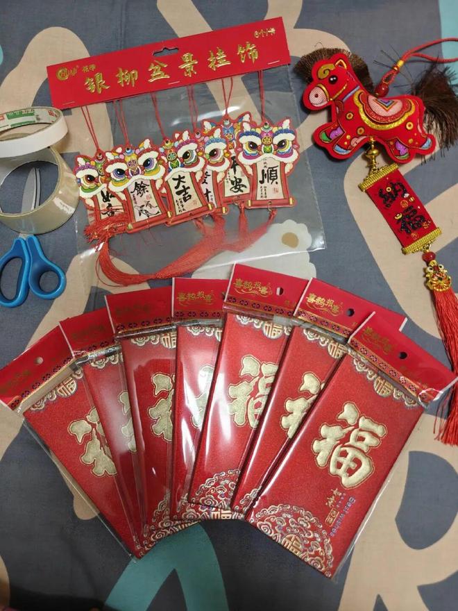 材料:36个红包,6个小挂饰,1个挂坠,1条红绳,以及双面胶和透明胶带。