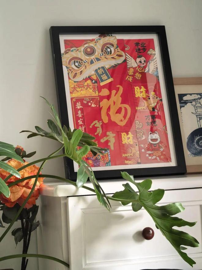 只需要将红包封面单独裁剪下来,再买个相框,将各种红包封面贴上去,就变成一幅特别喜庆的装饰画了。