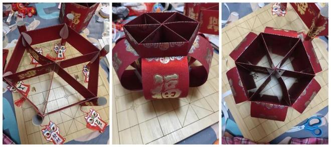 2)将3个红包剪成6面,用胶带在内部贴上6个挂饰;再分别卷成筒状,固定在底座的6个角上。