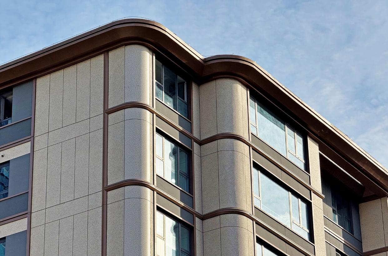 一楼基座为全石材,整体色调偏亮,并使用了大量横向、竖向香槟金线条装饰;南向转角处的曲面设计非常有现代感,识别度非常高。
