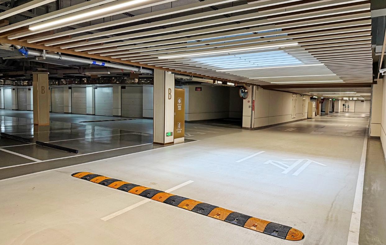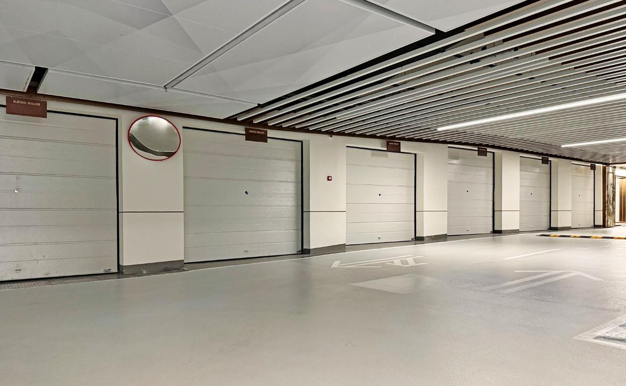 行车道顶部有金属格栅装饰,比较有特色的是部分车位设计成了车库,每个车库都有单独的卷闸门。