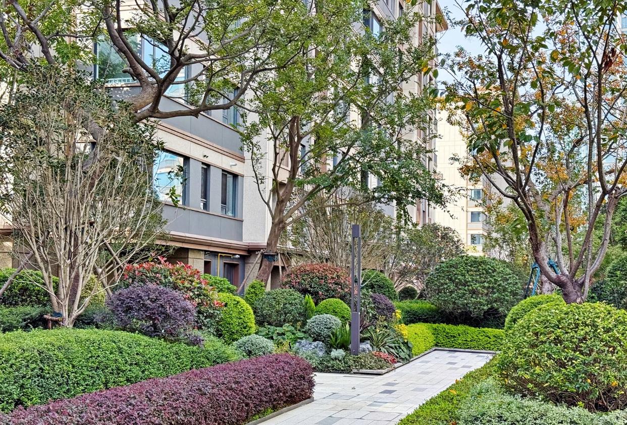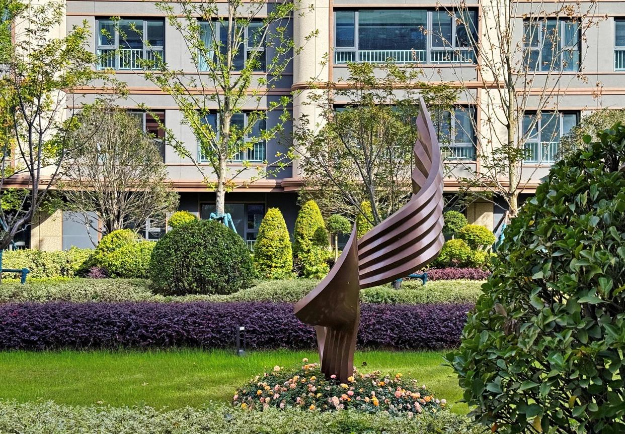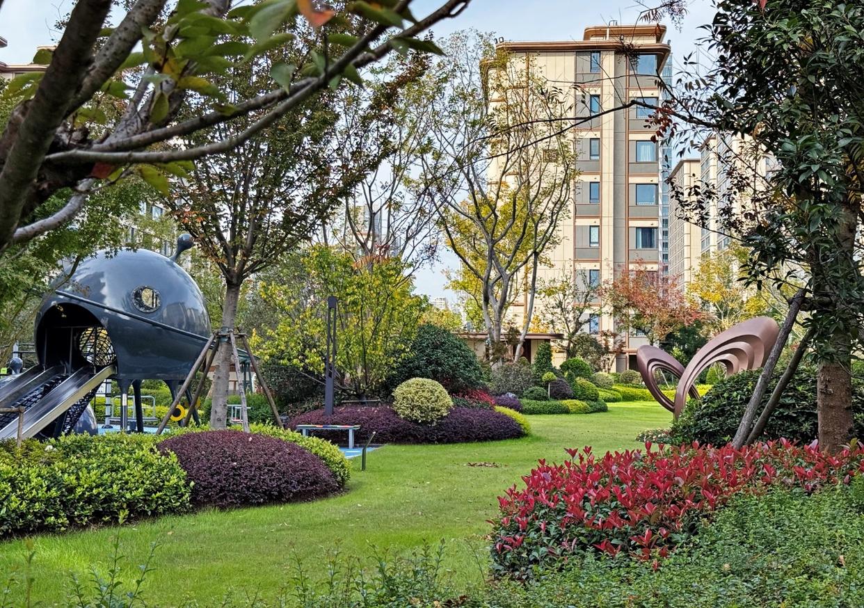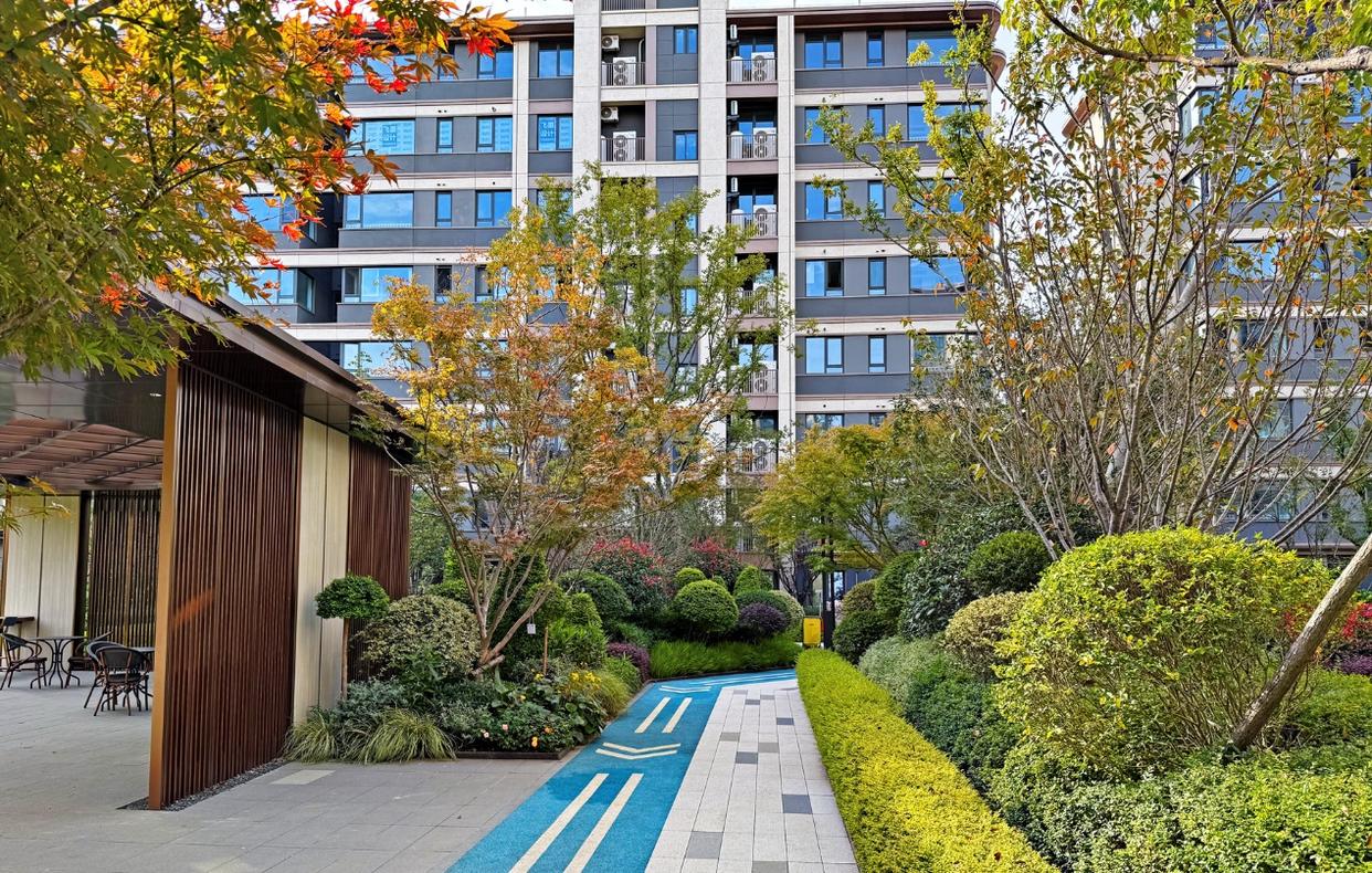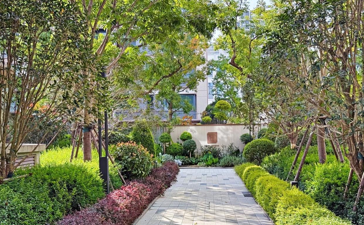 穿过景墙后,映入眼帘的是小区的横向景观轴,两侧的步道绿茵重重,球形灌木、杜鹃花和红枫、金桂等,层次分明,中心区域有一小片草坪景观,小型雕塑搭配花景显得很舒心。