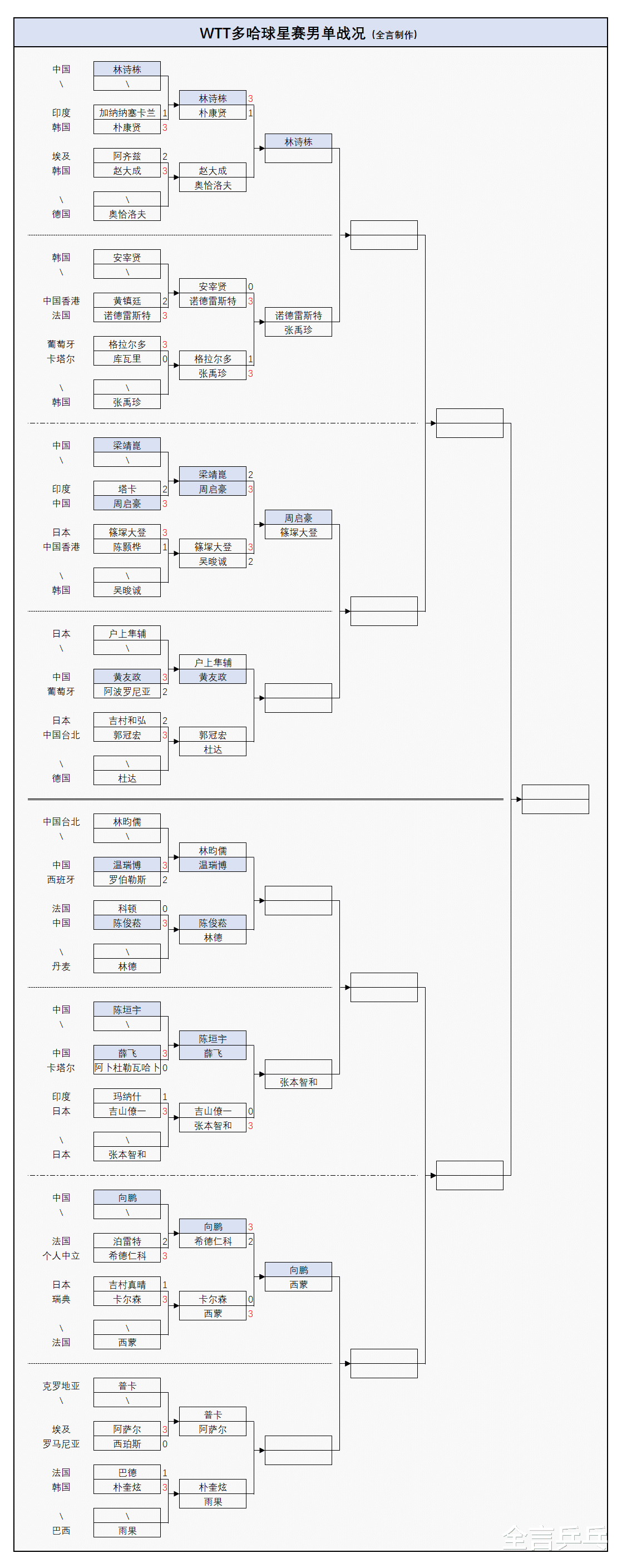 外协会方面,日本男单内战头号主力张本智和3-0胜队友吉山僚一,世界冠军篠塚大登遭遇险情,但最终还是3-2艰难击败韩国希望之星吴晙诚过关。