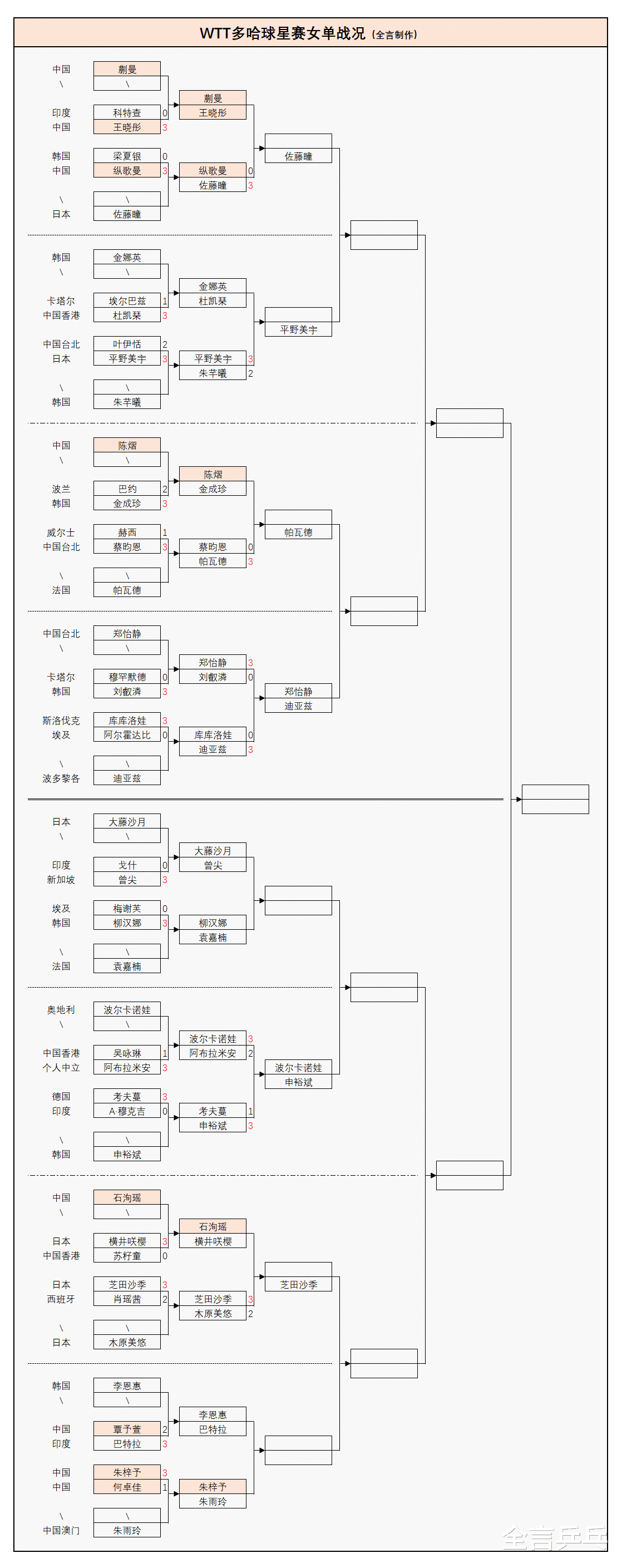 女单方面,国乒在资格赛被淘汰2人,分别是闫禹橦、韩菲儿,紧接着正赛首轮何卓佳不敌队友朱梓予、覃予萱败给印度一姐巴特拉,最终6人跻身32强,其中3人是首轮轮空入围。