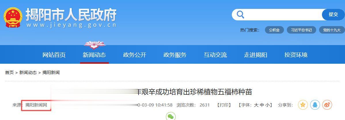 信息来源:揭阳新闻网《乡村教师历10年艰辛成功培育出珍稀植物五福柿种苗》 2020-03-09