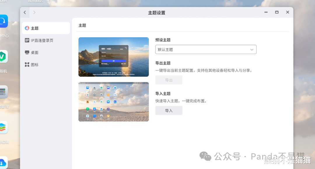 怎么进主题设置?直接桌面点击右键就行了。官方预设有默认主题和点阵星河主题,同时下方支持导出以及导入主题。左边的图显示的上方为 IP 直连时登录界面的图,下方则是 NAS 桌面的图。